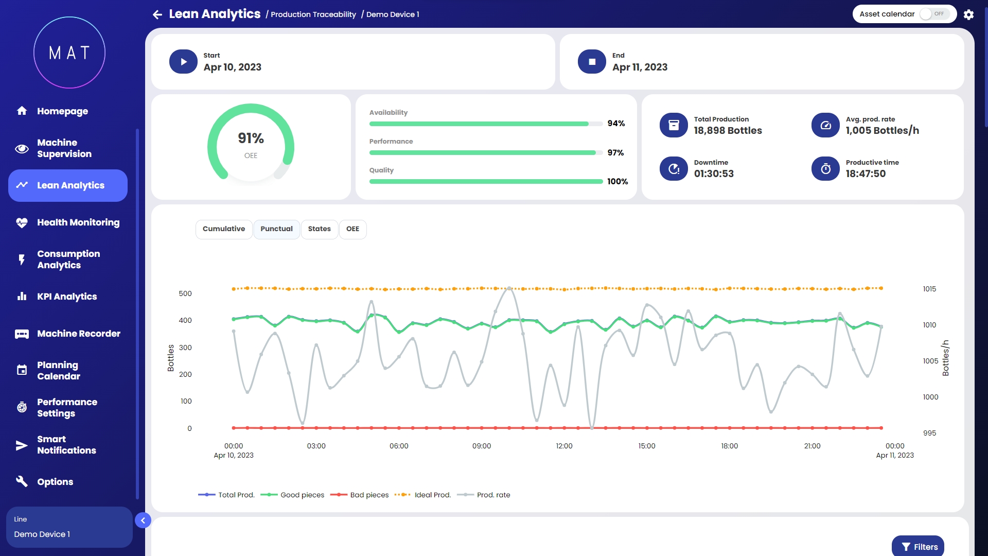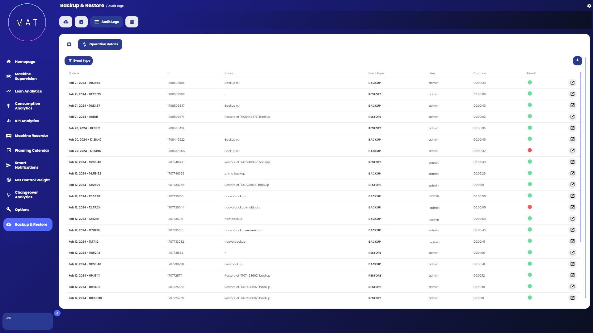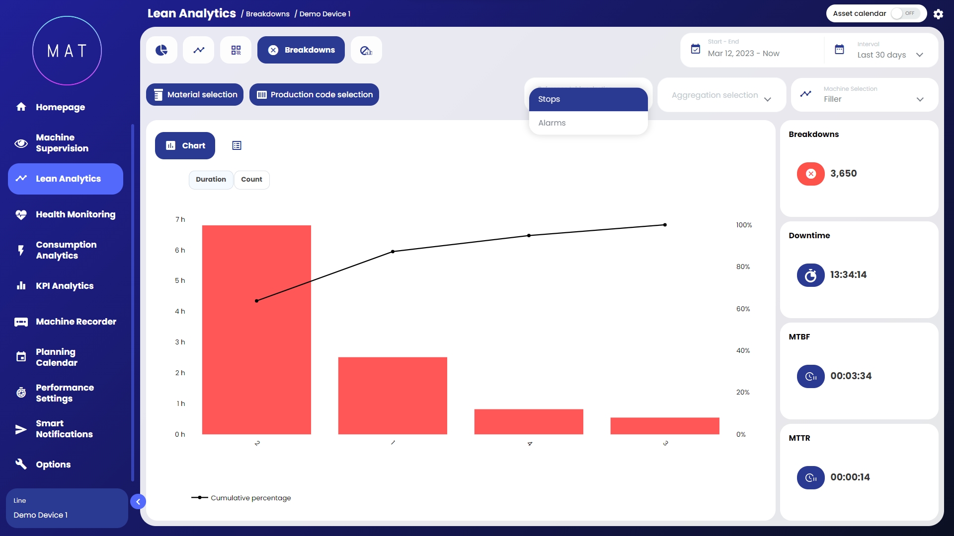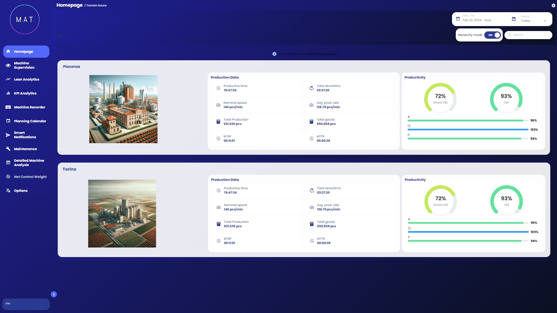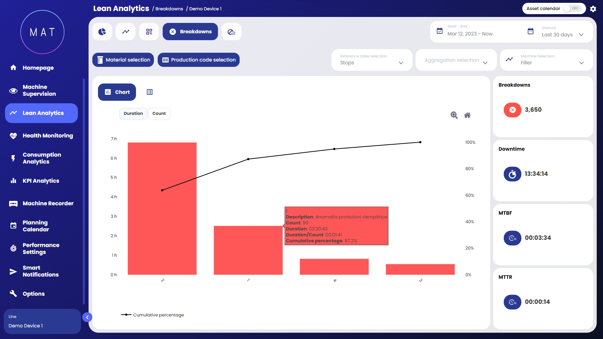 MAT - Machine Analytics Tool di 40Factory è la soluzione Industrial AIIoT (Artificial Intelligence Internet of Things) per la gestione dei diversi aspetti di macchine e linee connesse, tra cui: