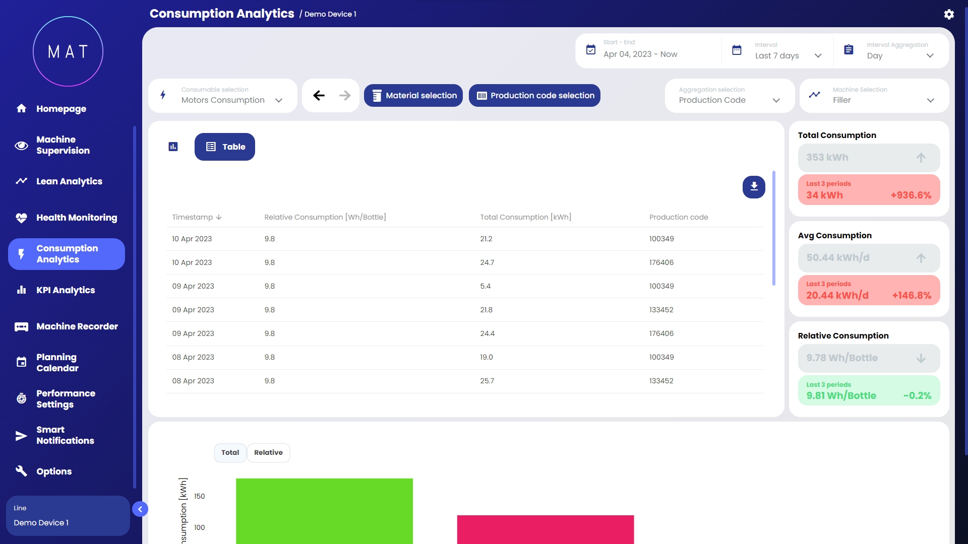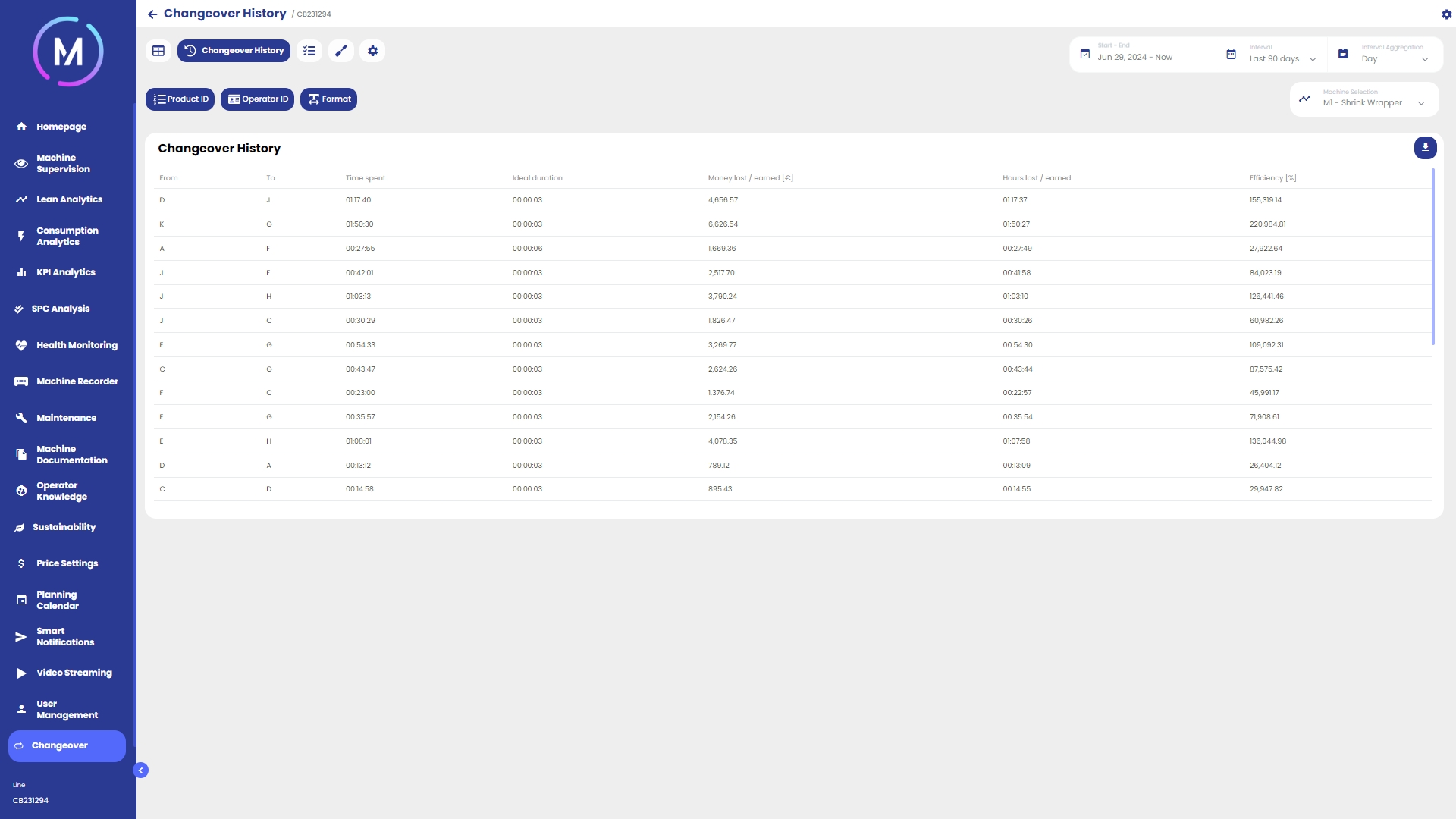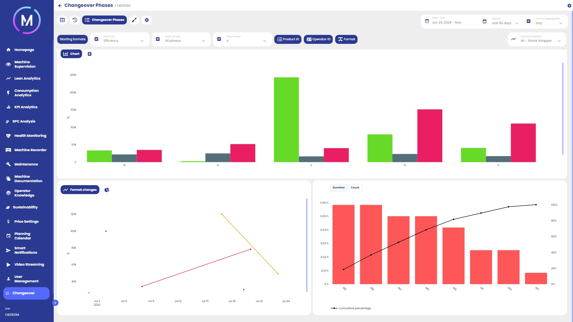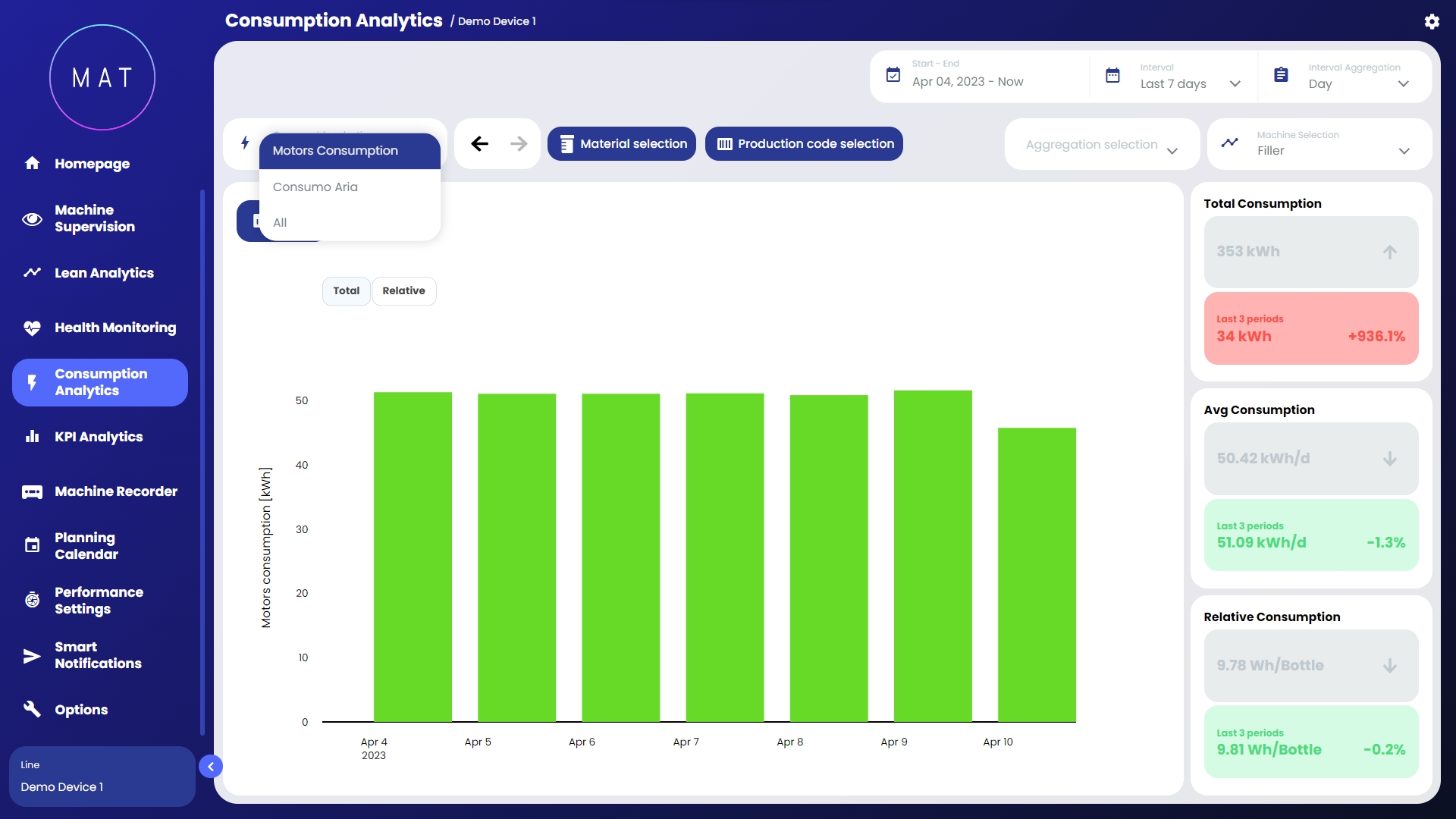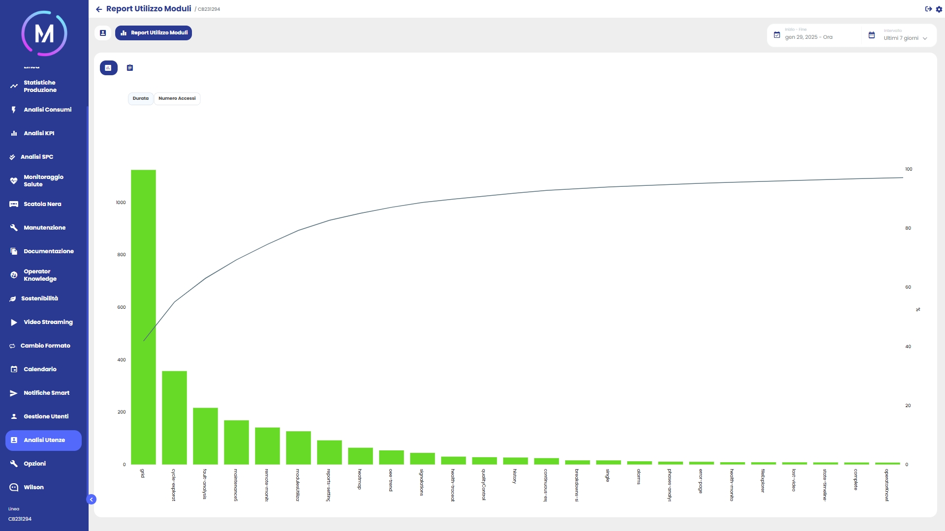 Modulo dedicato all’analisi dei consumi della macchina/linea, sia in termini di utility (energia, aria, gas, ecc.) sia in termini di materie prime (plastica, grano, gomma, ecc.)