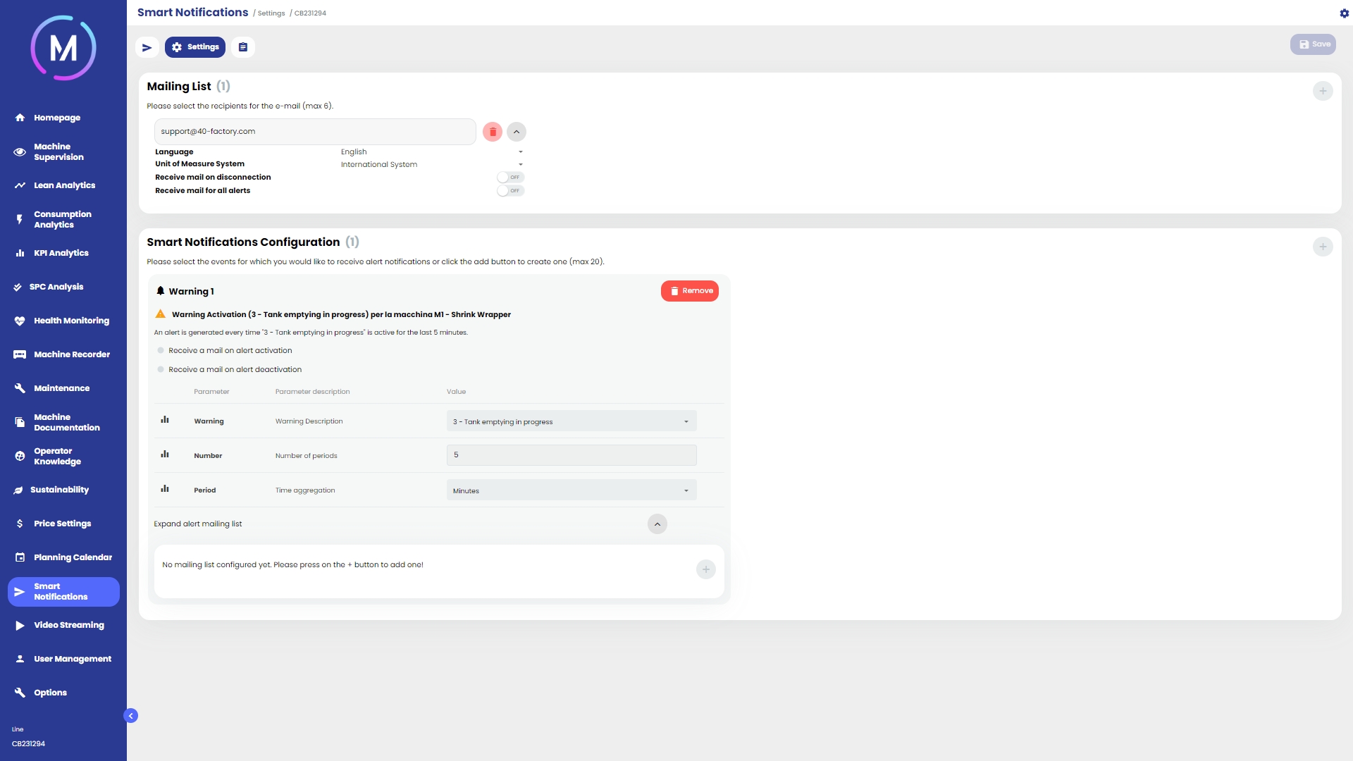 Si noti che, per ogni notifica, è possibile inserire una lista di indirizzi mail personalizzata. Sia gli indirizzi qui specificati che quelli configurati globalmente con l'opzione "Ricevi mail per tutti gli alert" riceveranno la notifica.