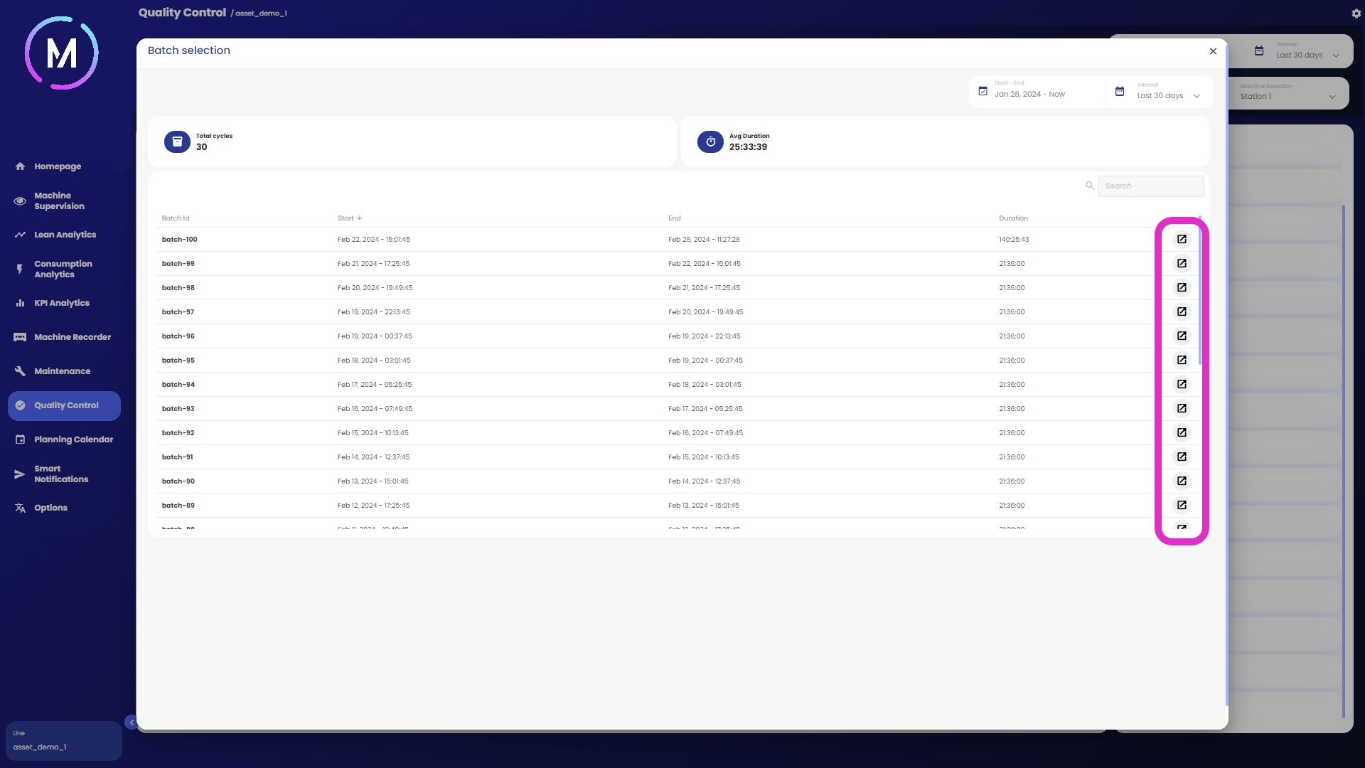 Se previsto, è possibile, per ogni allarme registrato, accedere alla sezione cliccando sulla icona “espandi” nell’ultima colonna a destra della dashboard: in questo modo è possibile osservare il comportamento delle variabili di processo e degli eventi macchina accaduti nell’intorno temporale di attivazione dell’allarme.