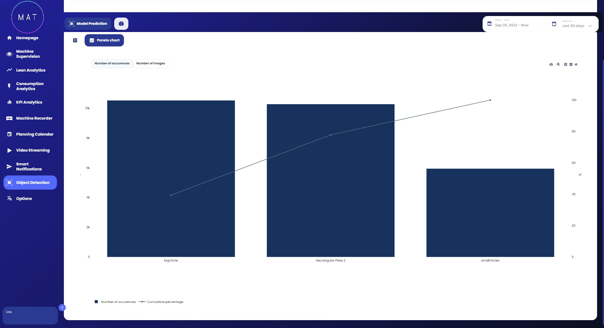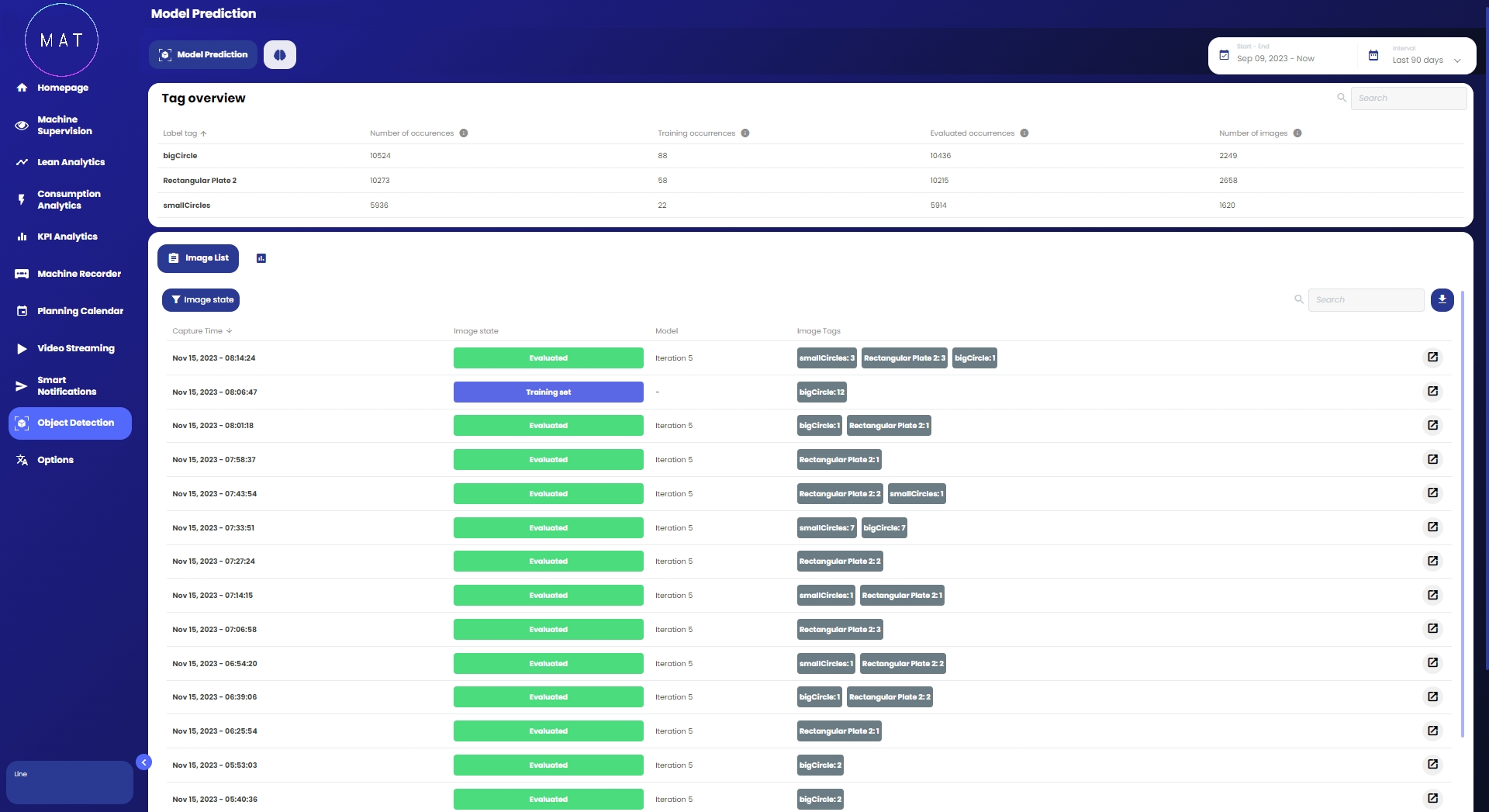 Nella parte inferiore della pagina viene mostrato l'elenco delle immagini che sono state valutate con alcune informazioni, come per esempio la data di valutazione, il modello utilizzato, i tag che sono stati associati all'immagine. Viene anche mostrato lo stato: un'immagine può essere Valutata se è stata ricevuta in ingresso ed è stata analizzata dal modello, mentre può essere Set di Training se l'utente ha deciso di modificare i tag associati ed ha salvato il suo lavoro. Oltre alla visualizzazione a lista, è possibile mostrare un grafico di tipo pareto che mostra la distribuzione dei tag utilizzati nelle varie immagini.