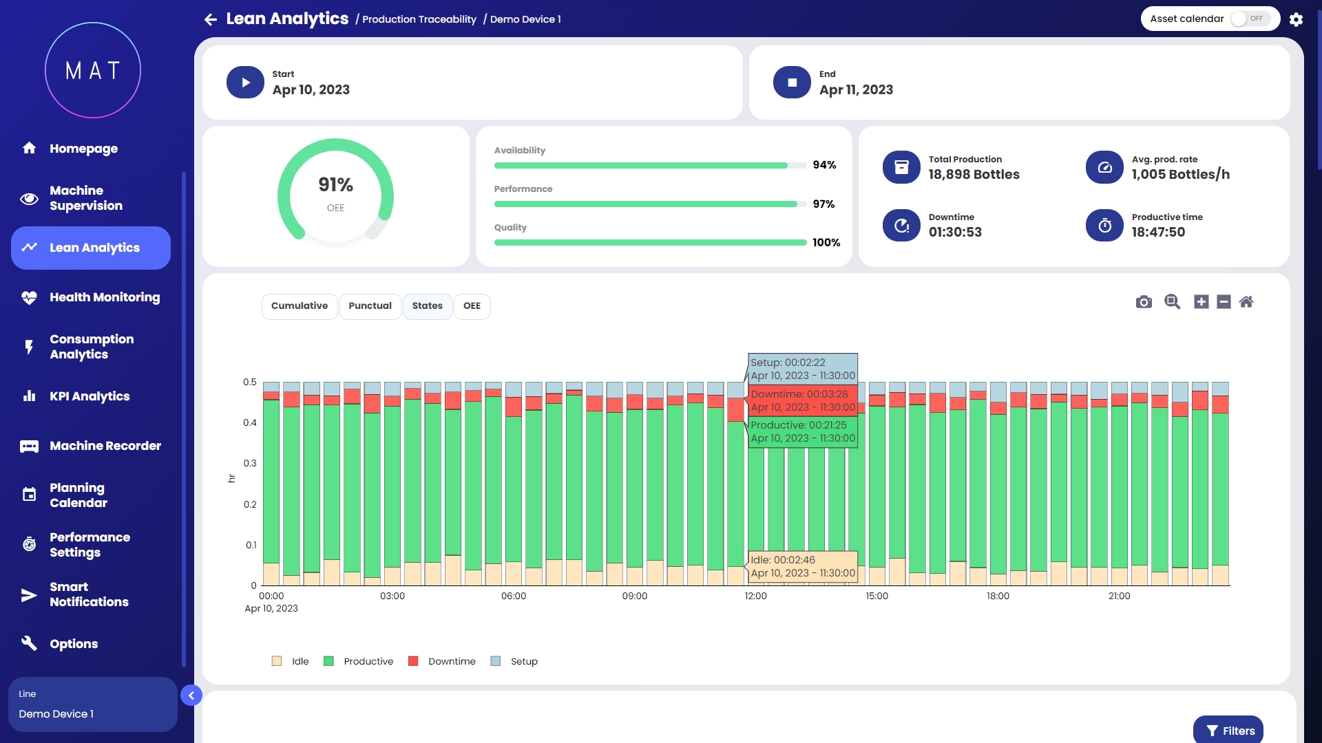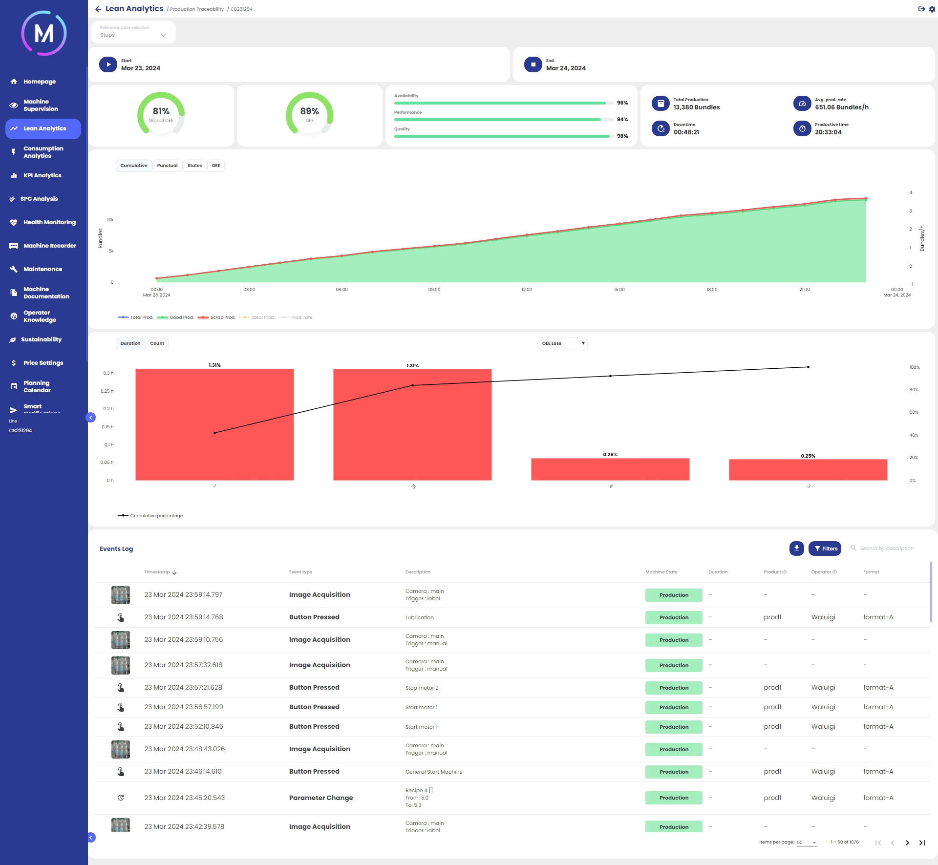 grafico cumulato e puntuale dei pezzi prodotti, grafico degli stati macchina susseguiti durante la porzione di produzione e trend dell’OEE (vedi immagini G, H, I, L);