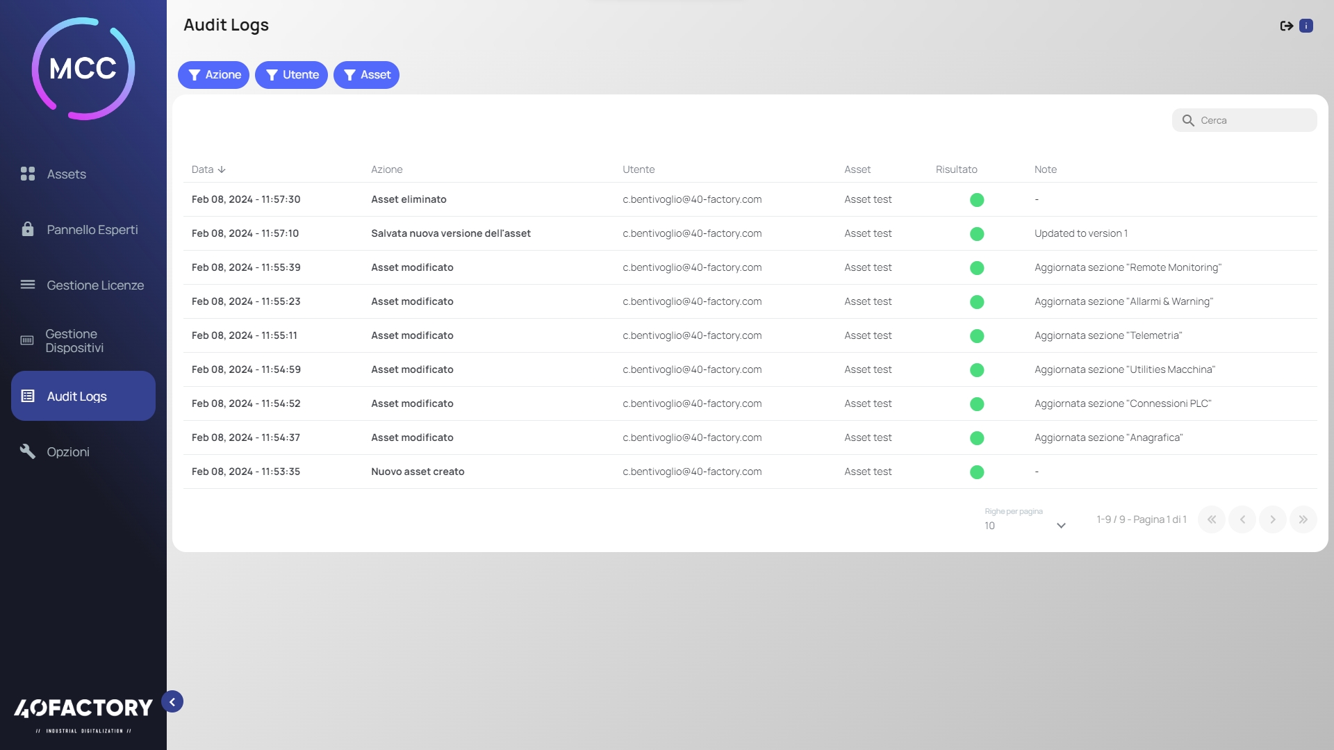 Questa sezione è composta da una tabella che consente di analizzare le azioni effettuate dai vari utenti all'interno di MCC.