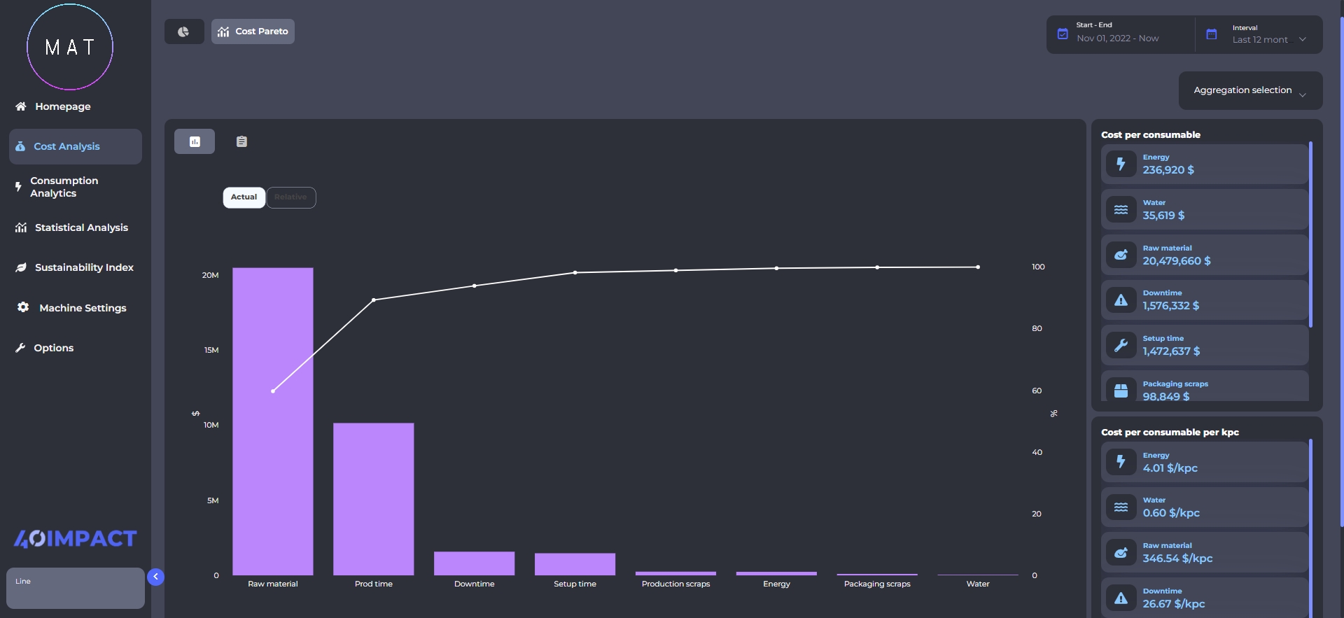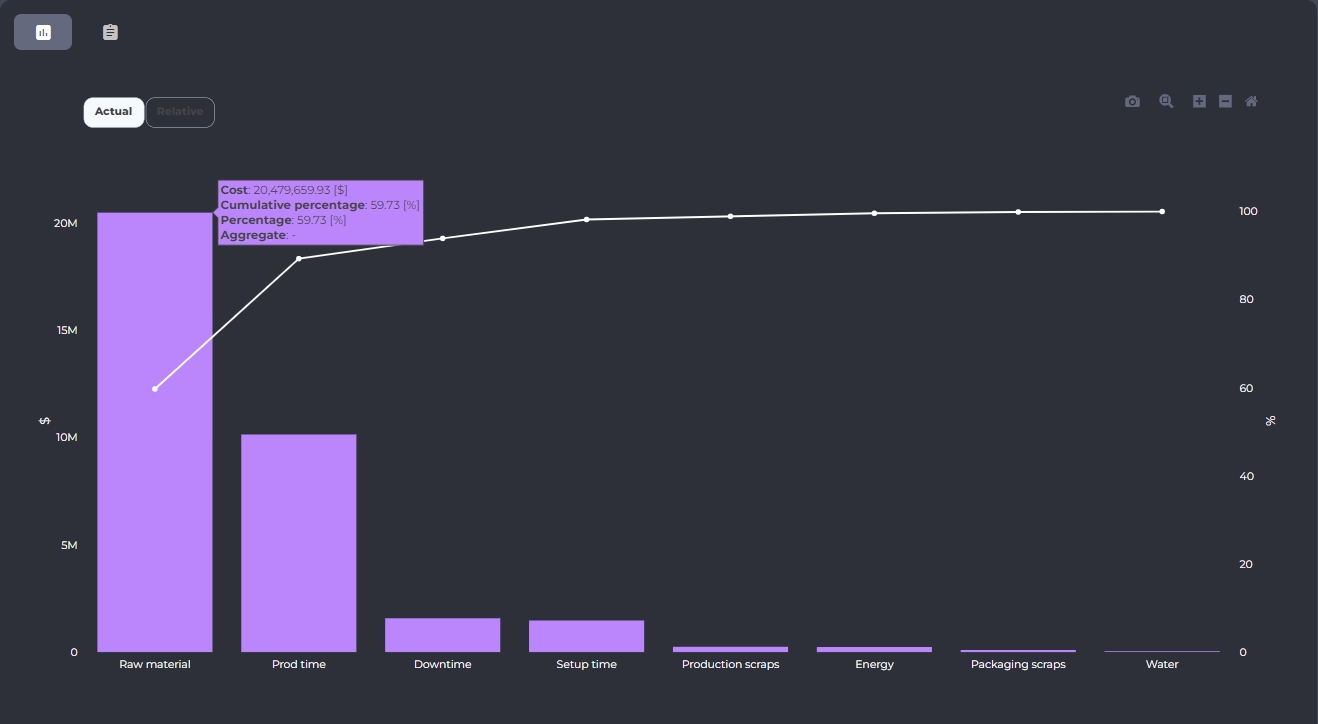Il pareto permette di apprezzare graficamente il costo che l'utilizzo di un consumabile ha comportato. Spostando il cursore sulle barre che lo compongono è possibile visualizzare, per ognuna, un fumetto di dettaglio.