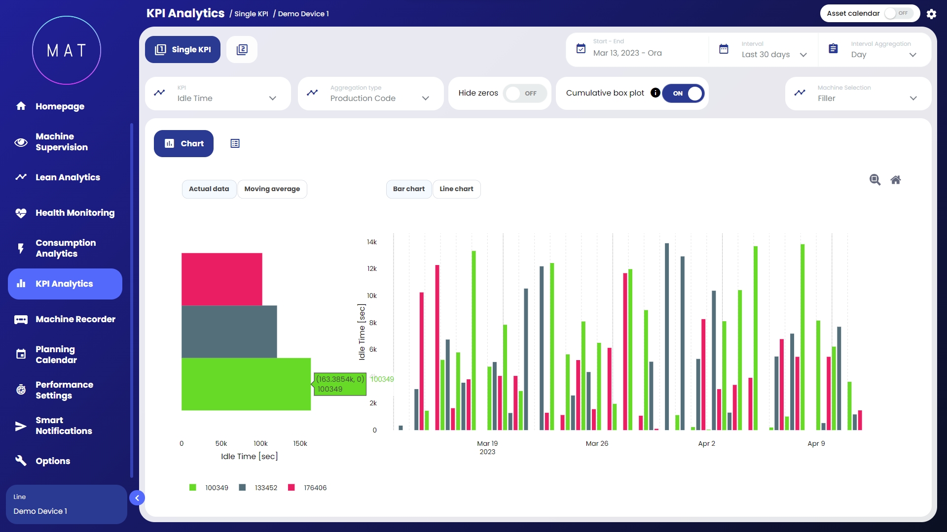filtro zeri. Considerando ad esempio il KPI “downtime”, che è caratterizzato dalla presenza di molti zeri (come nel caso di una macchina che va in stato di fermo raramente), attivando l’opzione “filtro zeri” il box plot a sinistra della dashboard ignora tutti i giorni (o i bucket di tempo in generale) che hanno come valore zero. In questo modo la distribuzione dei dati risulta “pulita” dal rumore dei giorni a zero.