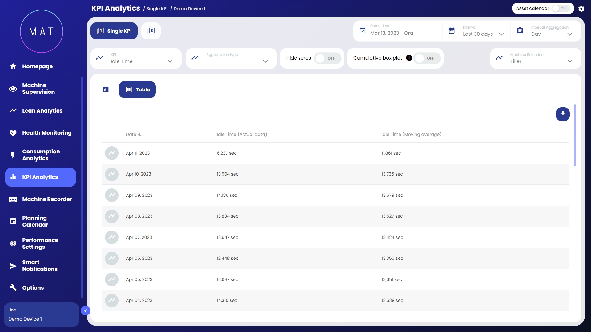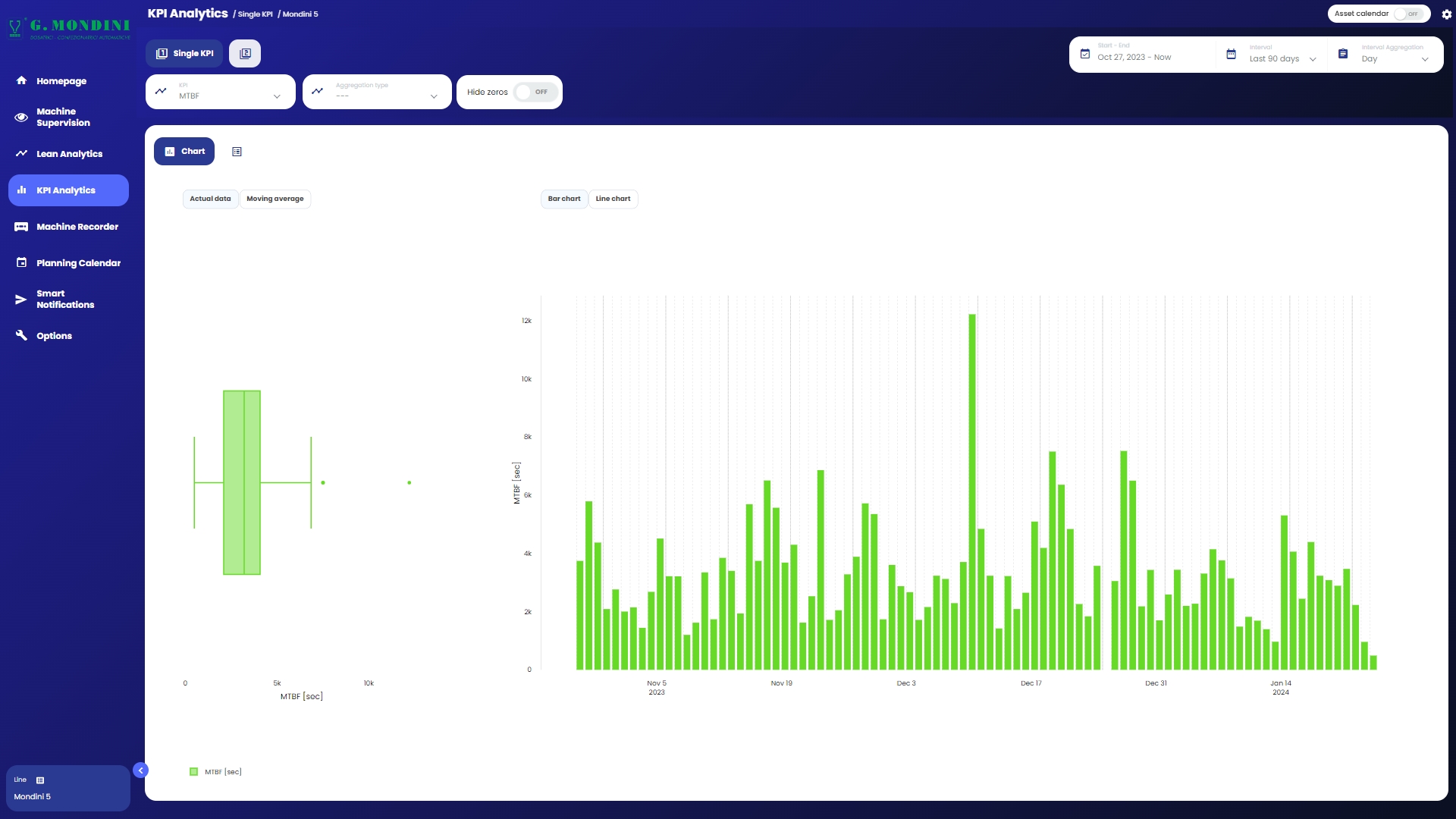 filtro zeri. Considerando ad esempio il KPI “downtime”, che è caratterizzato dalla presenza di molti zeri (come nel caso di una macchina che va in stato di fermo raramente), attivando l’opzione “filtro zeri” il box plot a sinistra della dashboard ignora tutti i giorni (o i bucket di tempo in generale) che hanno come valore zero. In questo modo la distribuzione dei dati risulta “pulita” dal rumore dei giorni a zero.