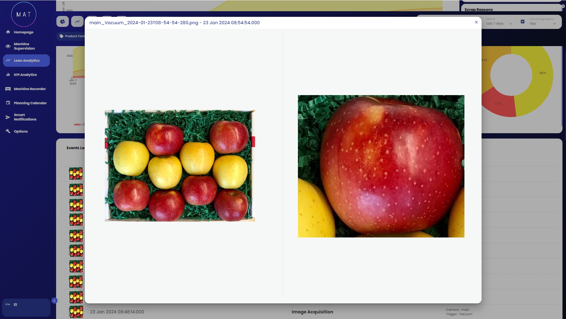 Una funzionalità aggiuntiva di questa pagina è disponibile per coloro che hanno a disposizione un sistema di telecamere e sensori i quali rilevano immagini in tempo reale sulla produzione. Infatti, in questa sezione è supportata la visualizzazione delle immagini di tutti i prodotti che sono stati etichettati come scarti.
