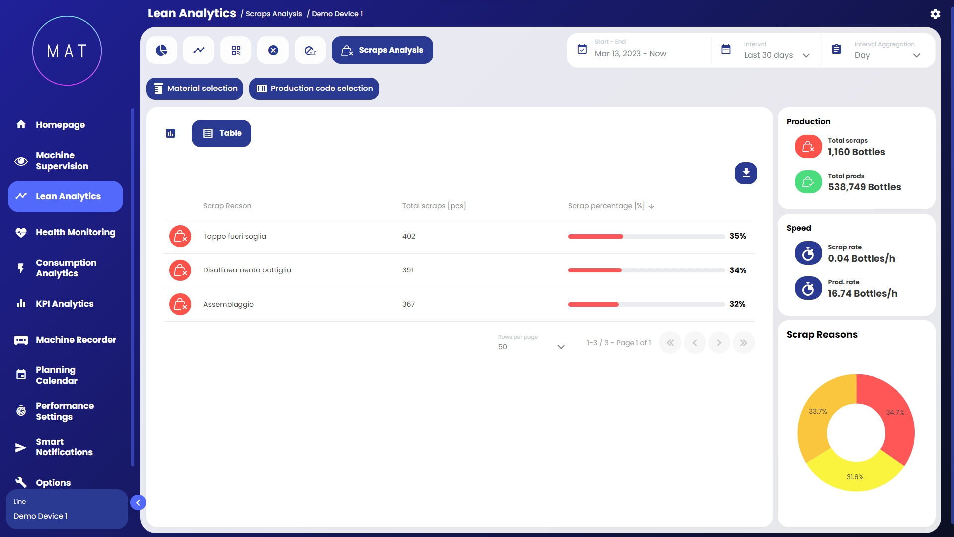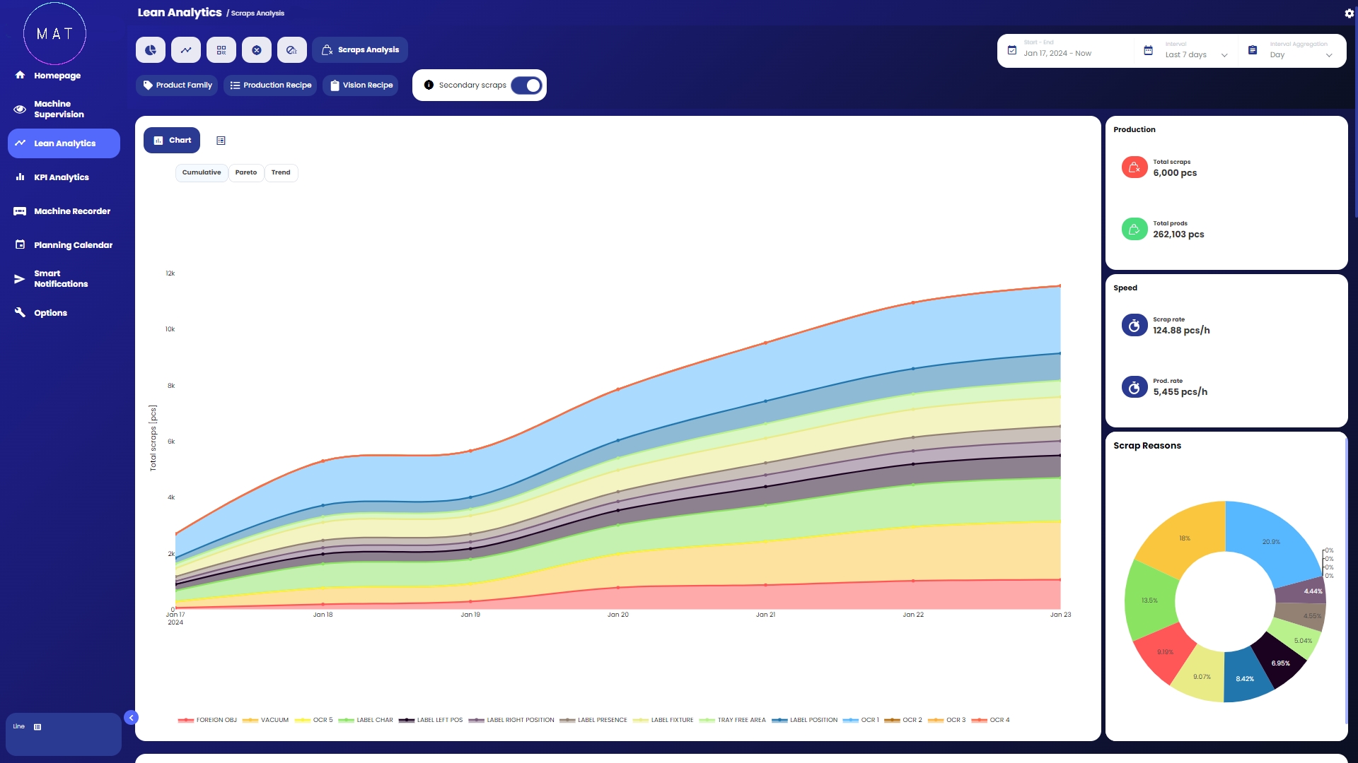 Sulla destra della dashboard compaiono widget che riportano informazioni riassuntive circa l’andamento dei pezzi non buoni prodotti. Generalmente, vengono rapportati i KPI di produzione totale e di scarto, al fine di calcolare l’incidenza di questi ultimi. È inoltre presente un grafico a torta per visualizzare graficamente l’incidenza delle cause di scarto con relativi valori percentuali e over-info.