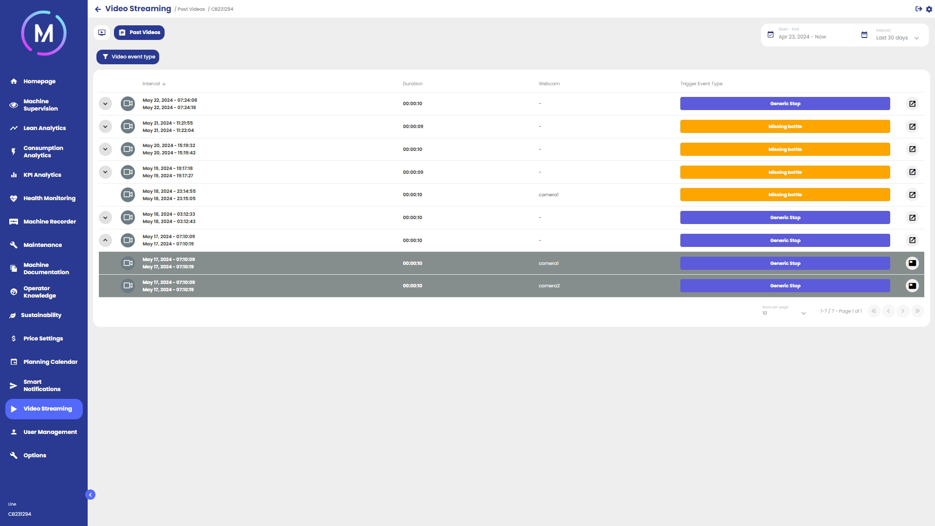 Ogni elemento presente nell'elenco fa riferimento ad una singola registrazione oppure ad un insieme di registrazioni contemporanee. Per ogni entry riportata nell'elenco vengono visualizzate alcune informazioni, come la categoria della ripresa di riferimento, la sua durata e la webcam che ha effettuato la registrazione. Inoltre, le entry che possono essere espanse permettono di visualizzare quali registrazioni contemporanee sono avvenute.