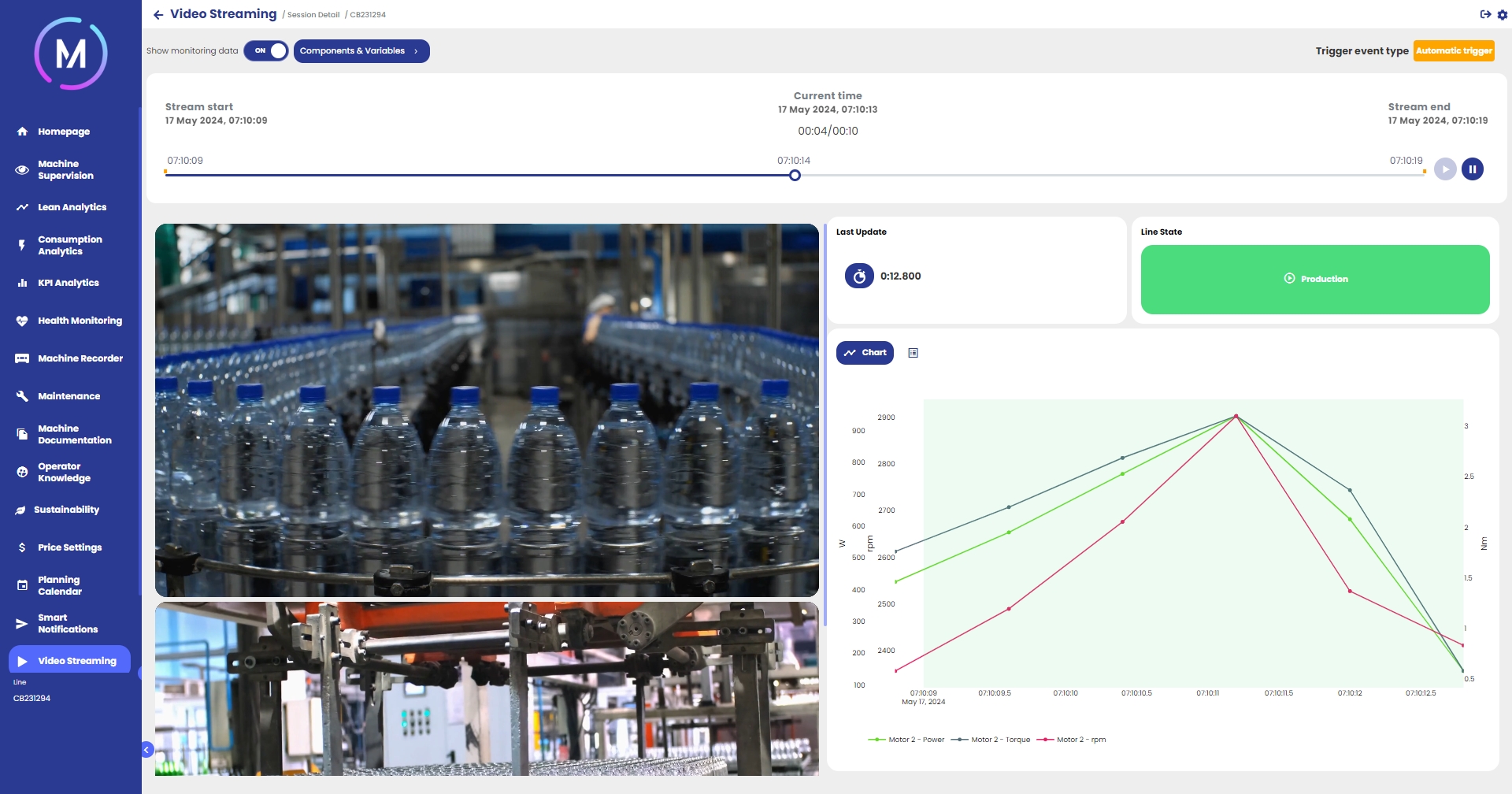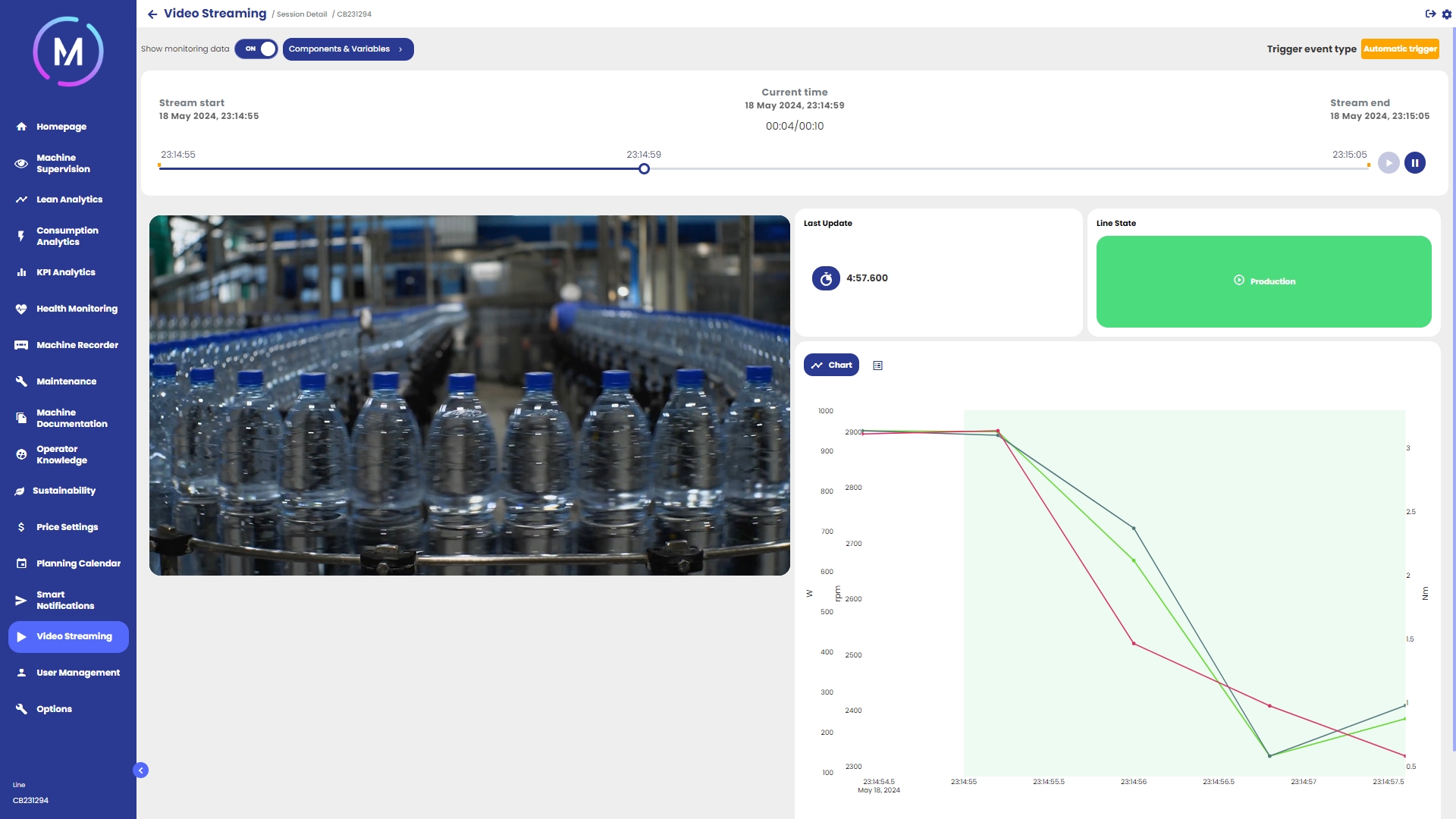 Mentre la parte sinistra è occupata dai video, la parte destra della visualizzazione presenta un grafico dinamico che rappresenta l'andamento delle variabili negli stessi istanti coperti dalla registrazione. Nella parte alta della pagina è presente una spunta che permette di rimuovere il grafico a piacimento. Le variabili da mostrare al suo interno possono essere selezionate tramite l'apposito controllo.