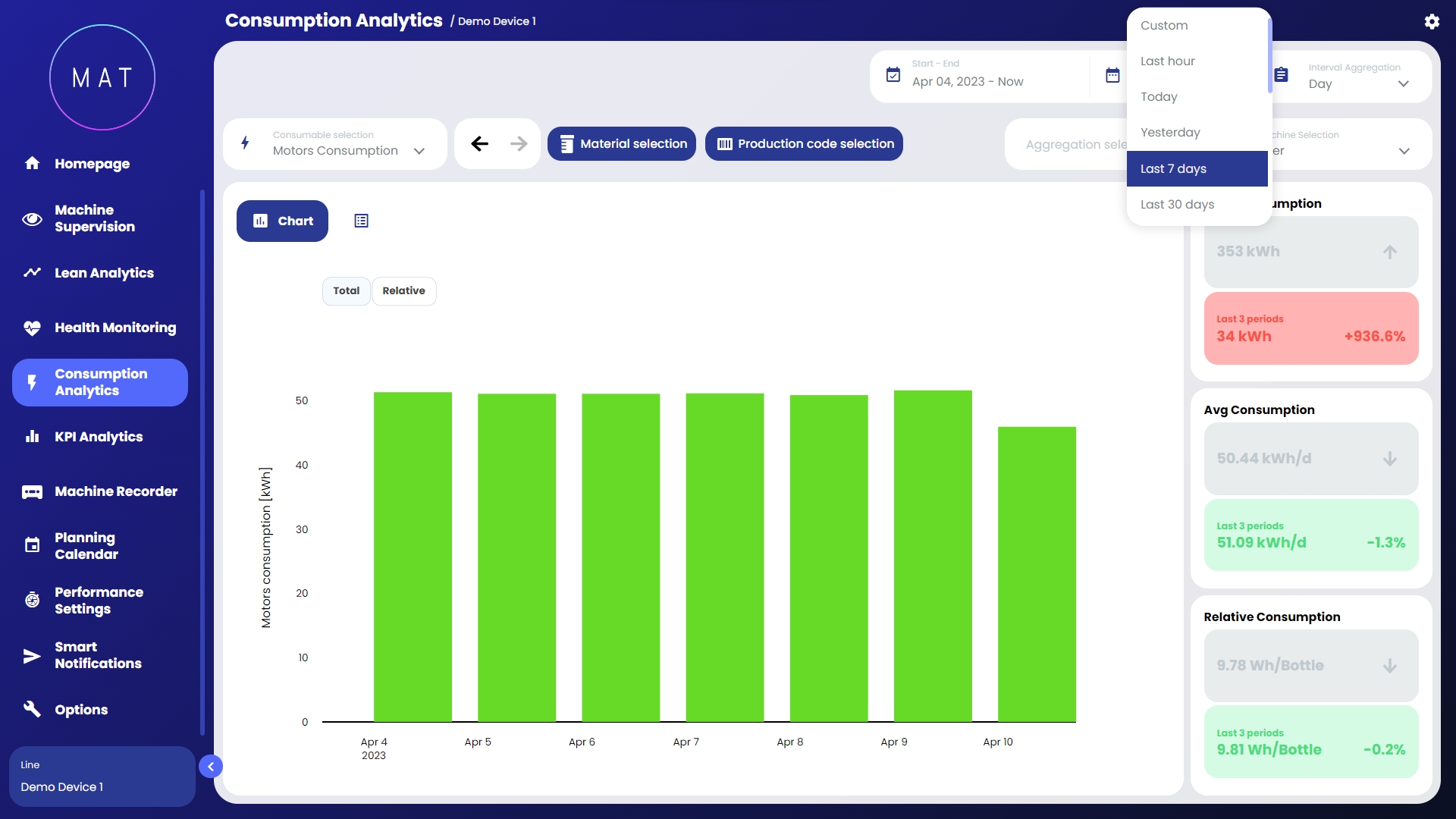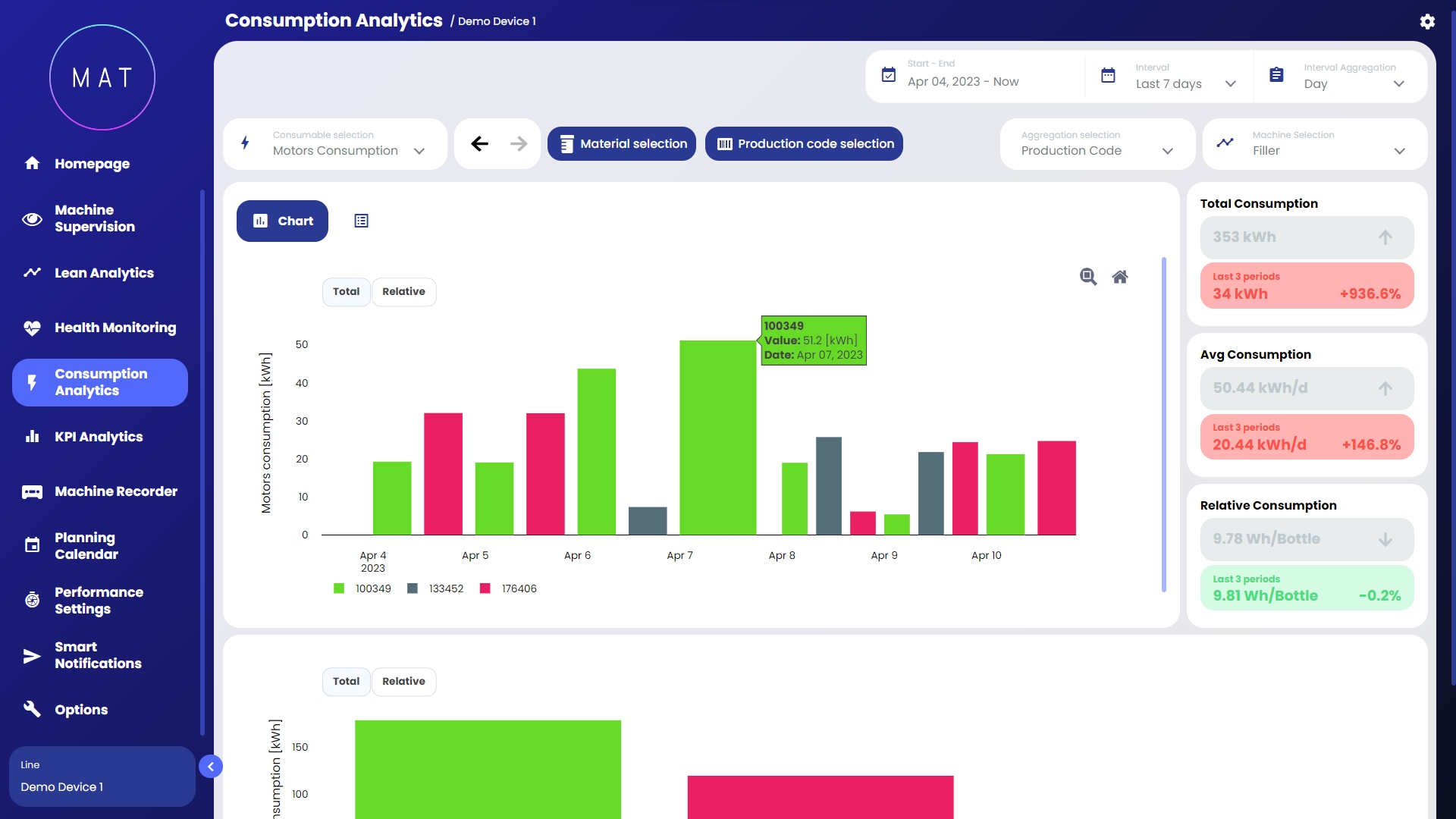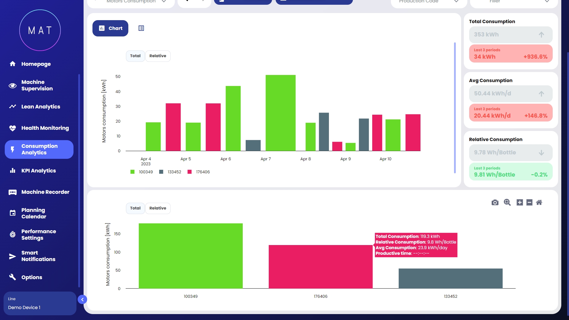 Modulo dedicato all’analisi dei consumi della macchina/linea, sia in termini di utility (energia, aria, gas, ecc.) sia in termini di materie prime (plastica, grano, gomma, ecc.)