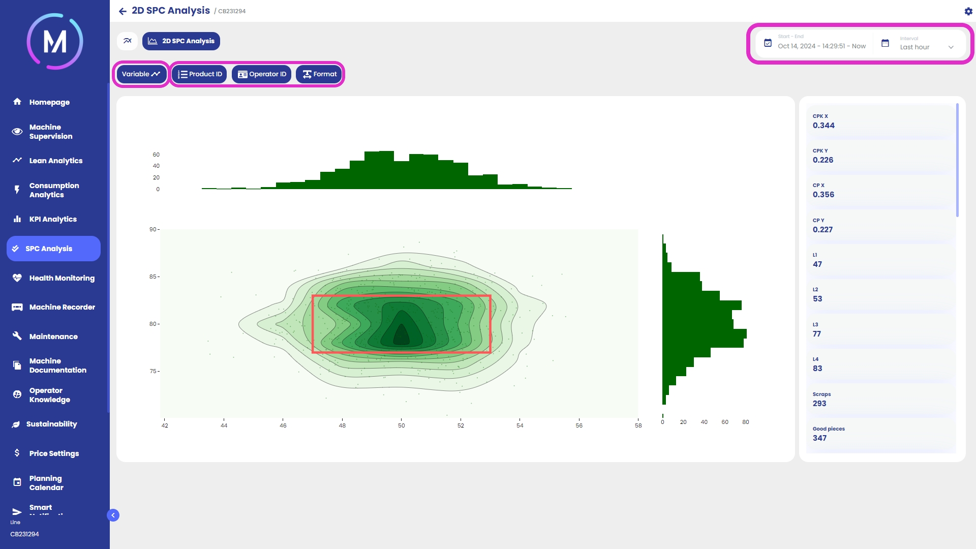 Le pagine SPC offrono strumenti per il controllo statistico di processo della produzione, con un'interfaccia che consente agli utenti di monitorare i parametri di conformità. Nella versione classica, è possibile analizzare i dati relativi a unità prodotte, scarti, e vincoli applicati, mentre selettori permettono di definire l'intervallo temporale e la sotto-macchina per l'analisi. La versione 2D aggiunge un'analisi multidimensionale, permettendo di controllare diversi aspetti del prodotto contemporaneamente, fornendo una visione più approfondita della qualità della produzione. Entrambe le versioni offrono flessibilità nella configurazione dell'analisi e supportano l'identificazione rapida di eventuali anomalie nei processi produttivi.