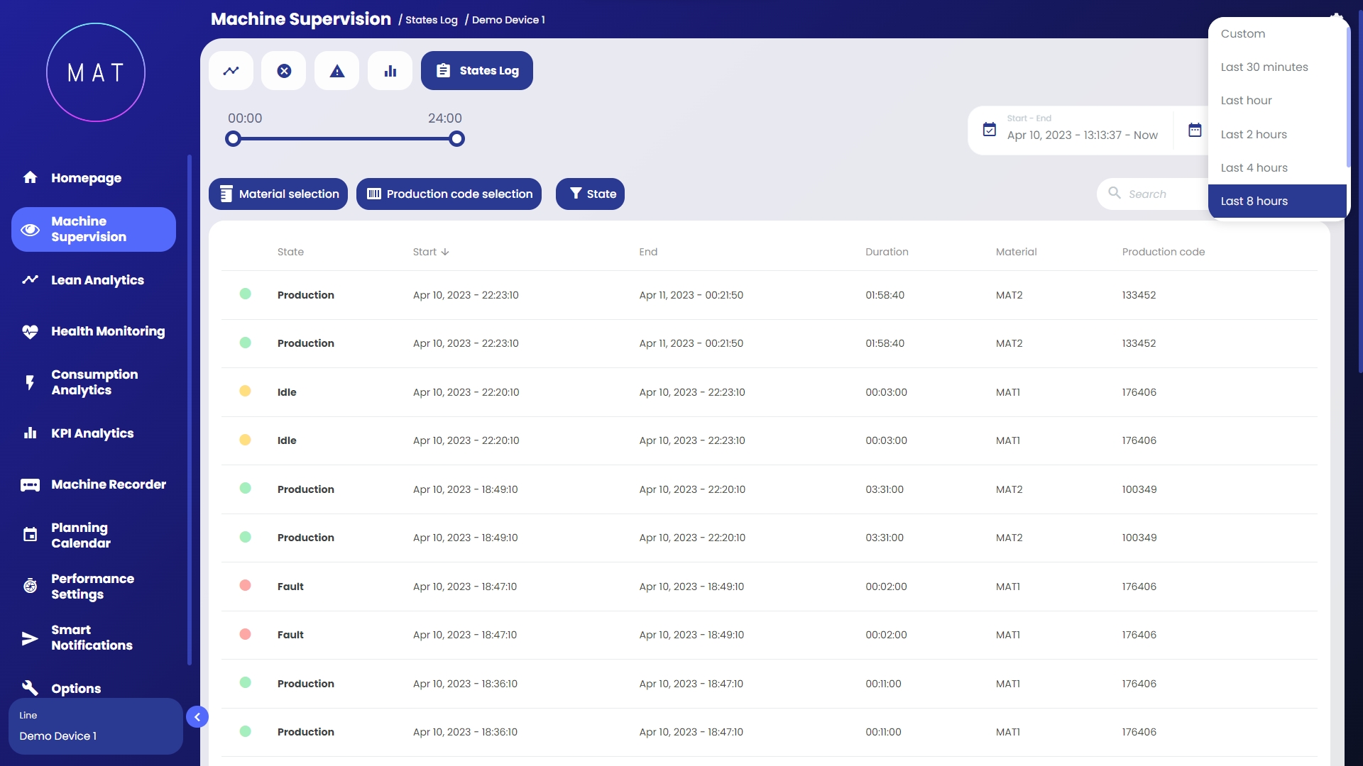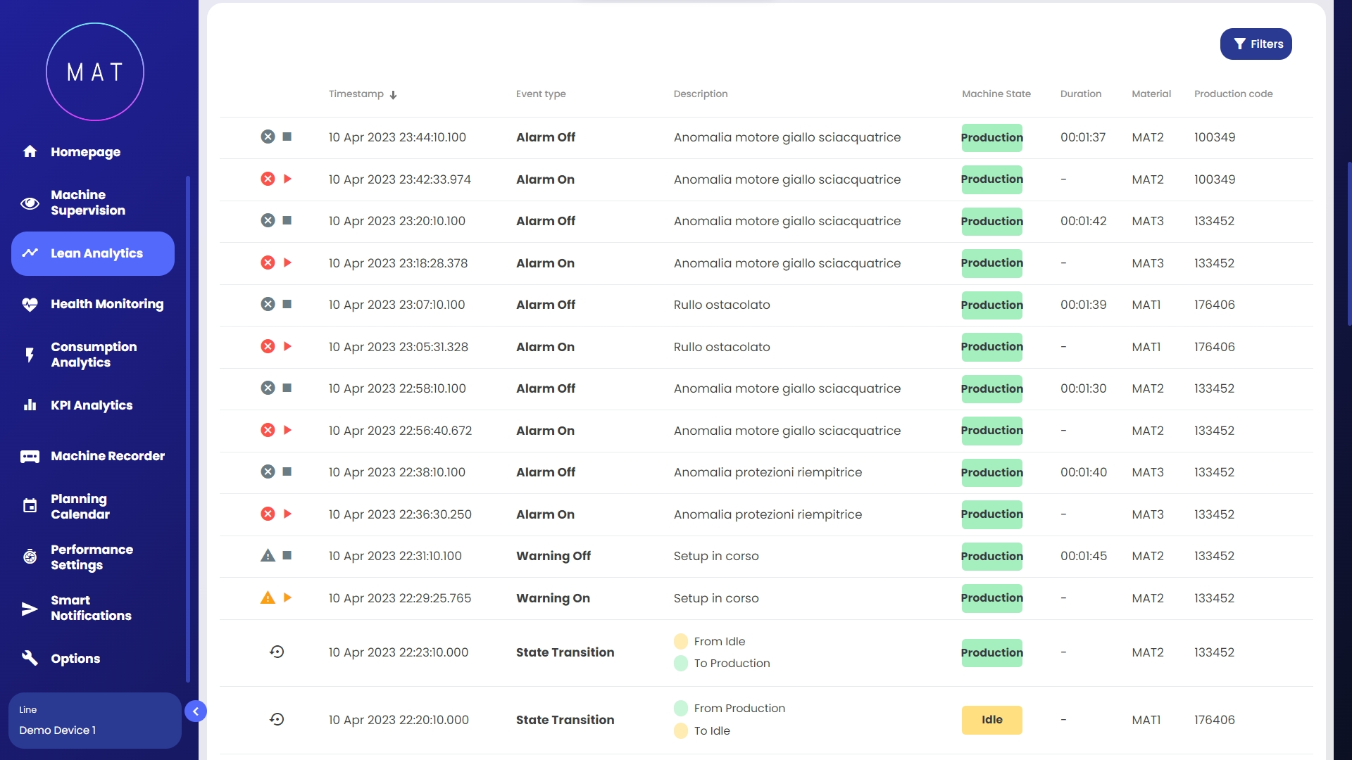 Utilizzando gli appositi filtri, è possibile visualizzare l’elenco dei cambi di stato specifici per, ad esempio, il tipo di programma, di macchina, di ricetta ecc.