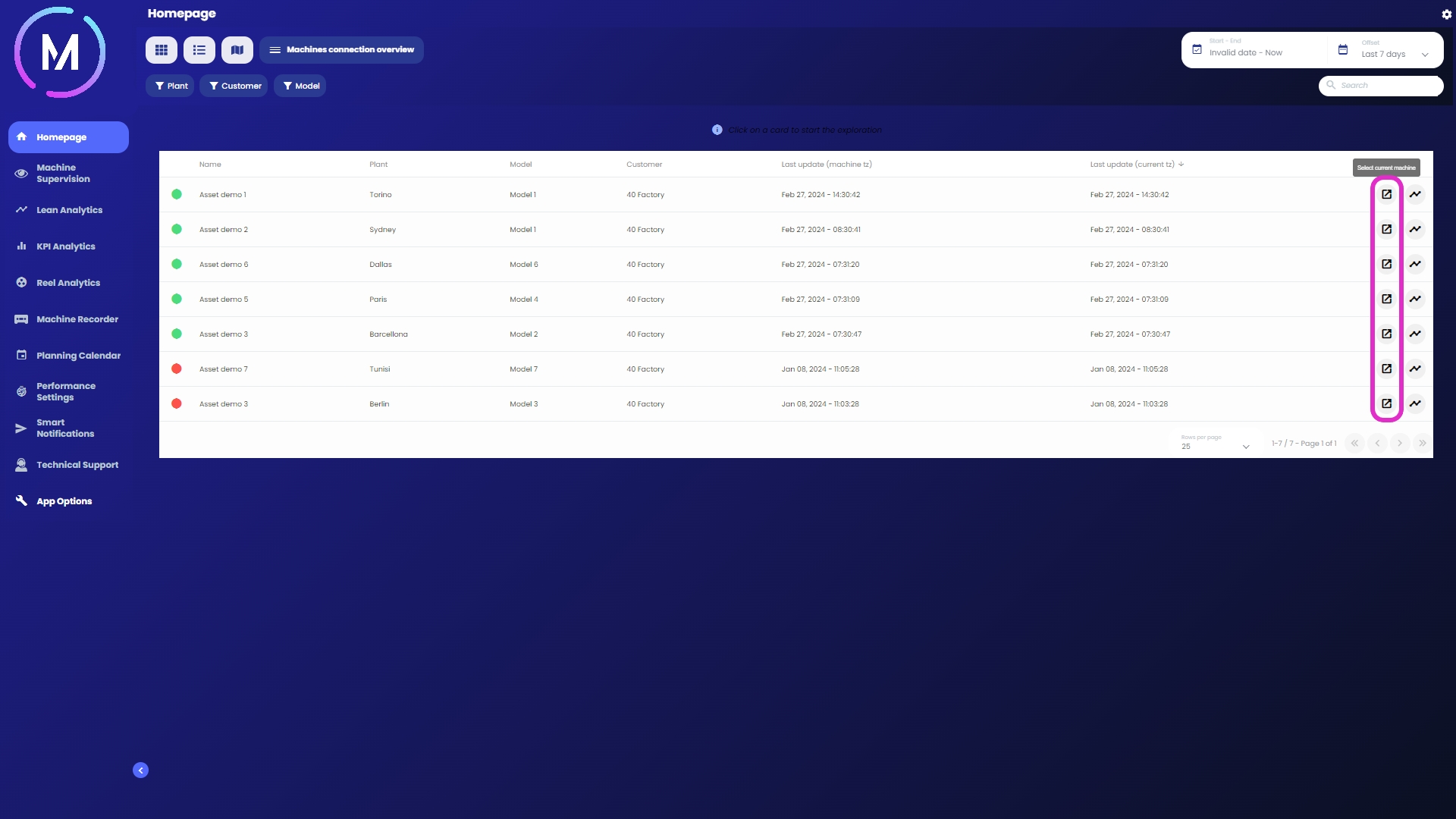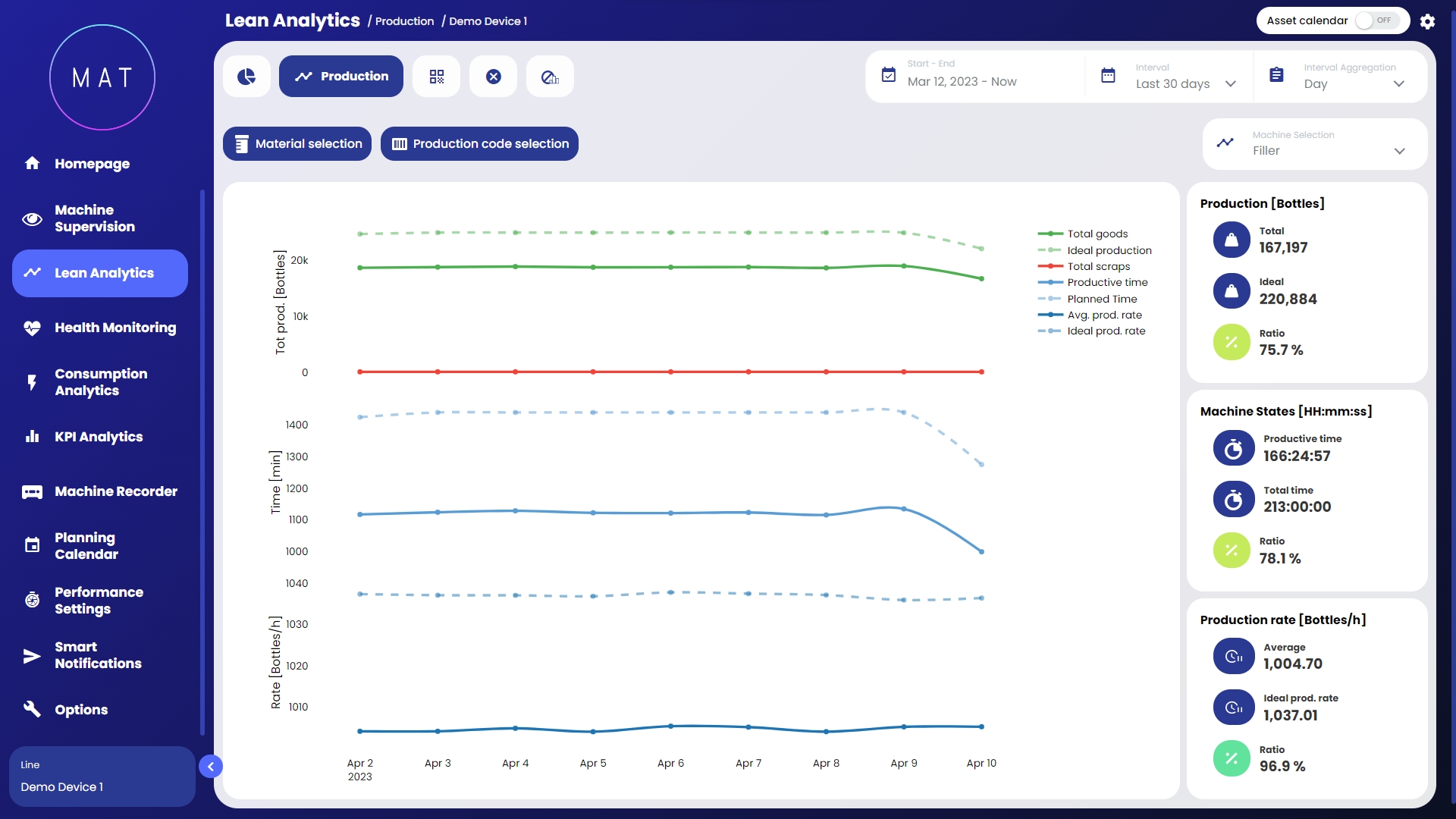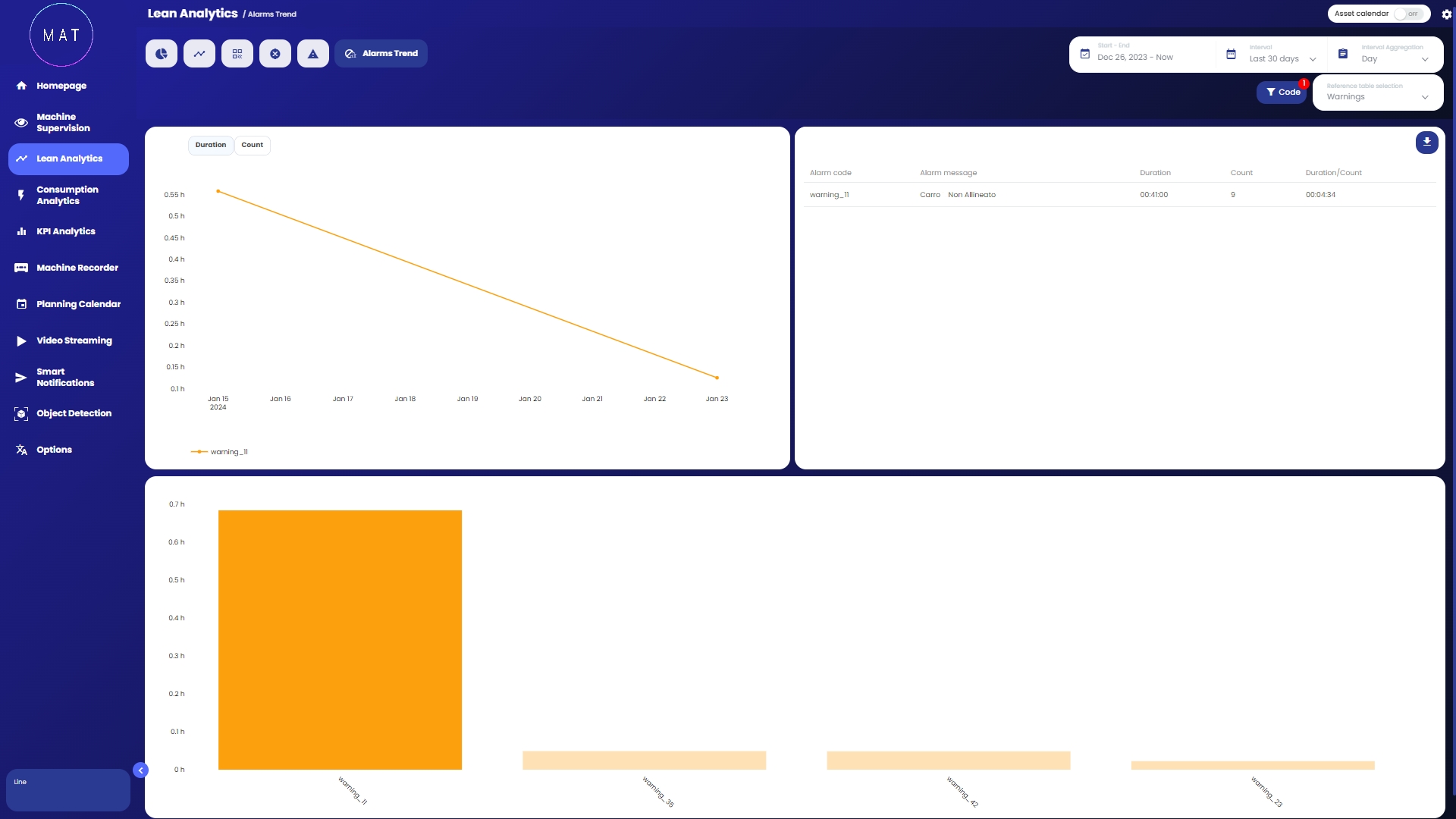 I raw data di macchine e linee acquisiti, storicizzati, elaborati e trasformati in smart data sono visualizzabili e analizzabili direttamente nell’applicazione tramite dashboard realizzate con tecniche di UI/UX design finalizzate a rendere la comprensione e la navigazione semplice ed intuitiva.