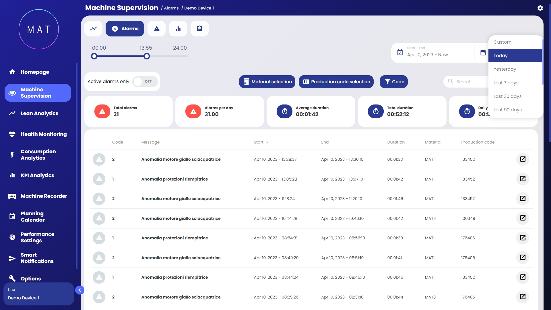 Quando previsto, l’utente può selezionare il tipo di aggregatore temporale sulla base del quale visualizzare i dati (ora/giorno/settimana/mese). Ciò consente di identificare immediatamente periodi produttivi più o meno critici che meritano di essere analizzati nel dettaglio, con il supporto dei moduli dell’applicazione.