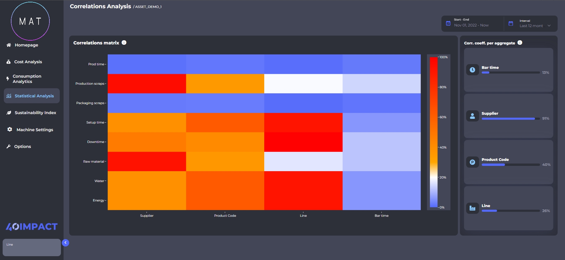 In questa sezione viene presentata un'analisi statistica sui dati nell'intervallo temporale selezionato. L'intera pagina è dominata da una heatmap, la quale rappresenta in maniera grafica il livello di correlazione di costo presente fra i diversi elementi inclusi nell'analisi. Lateralmente è possibile notare la percentuale di correlazione che ogni singolo aggregato dimostra rispetto al costo totale.