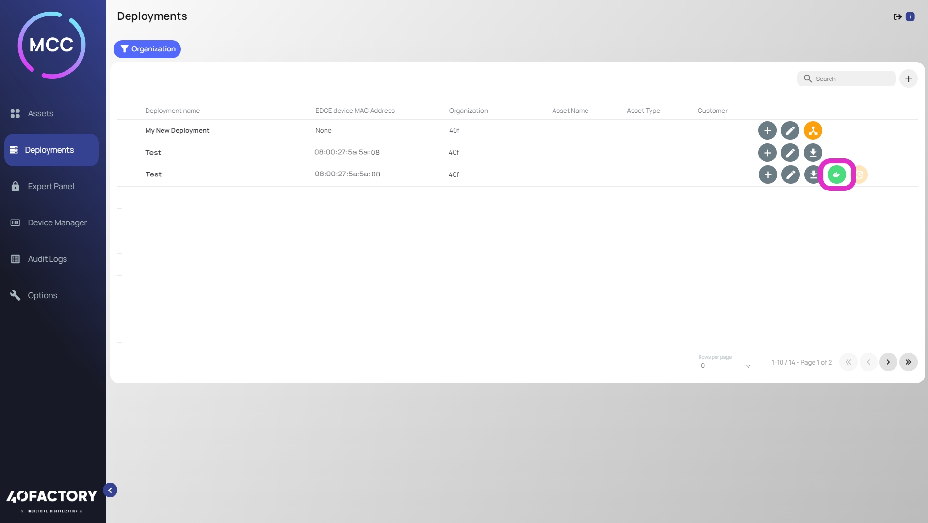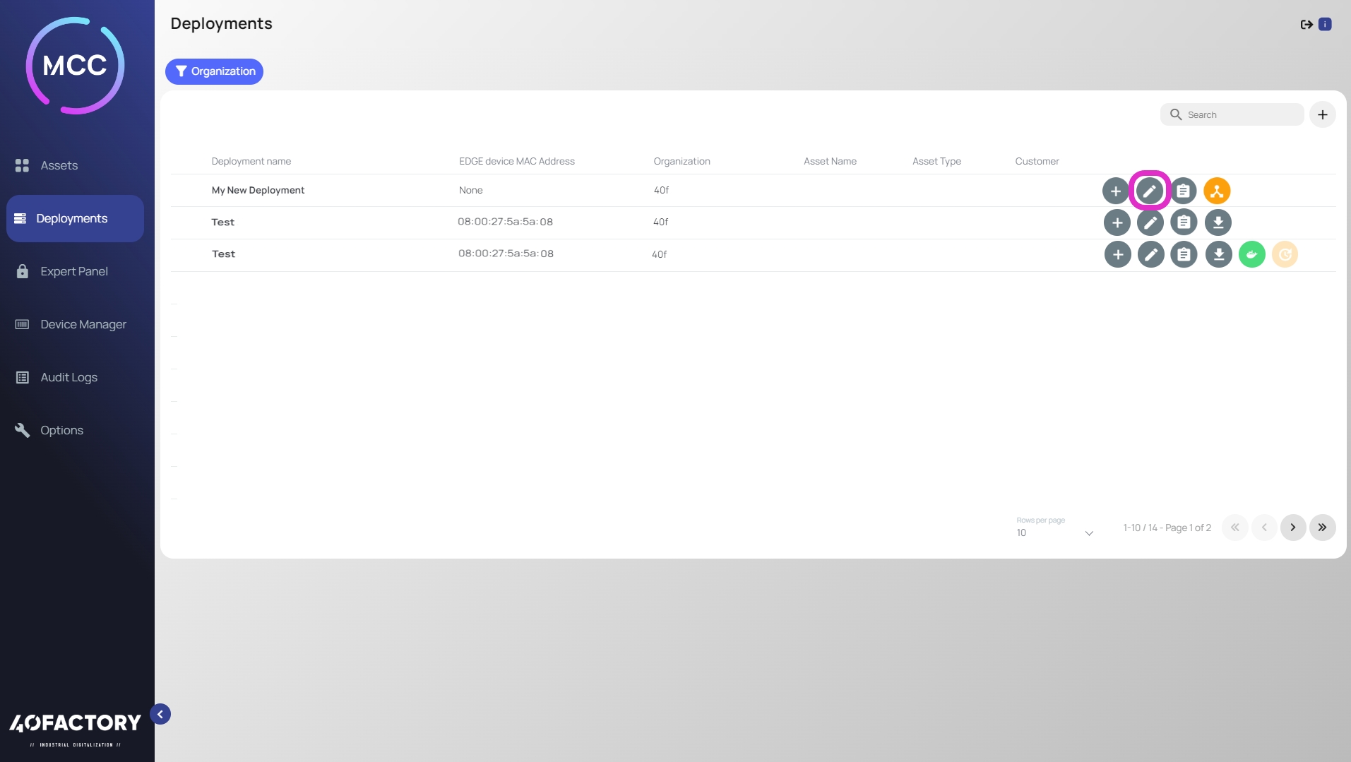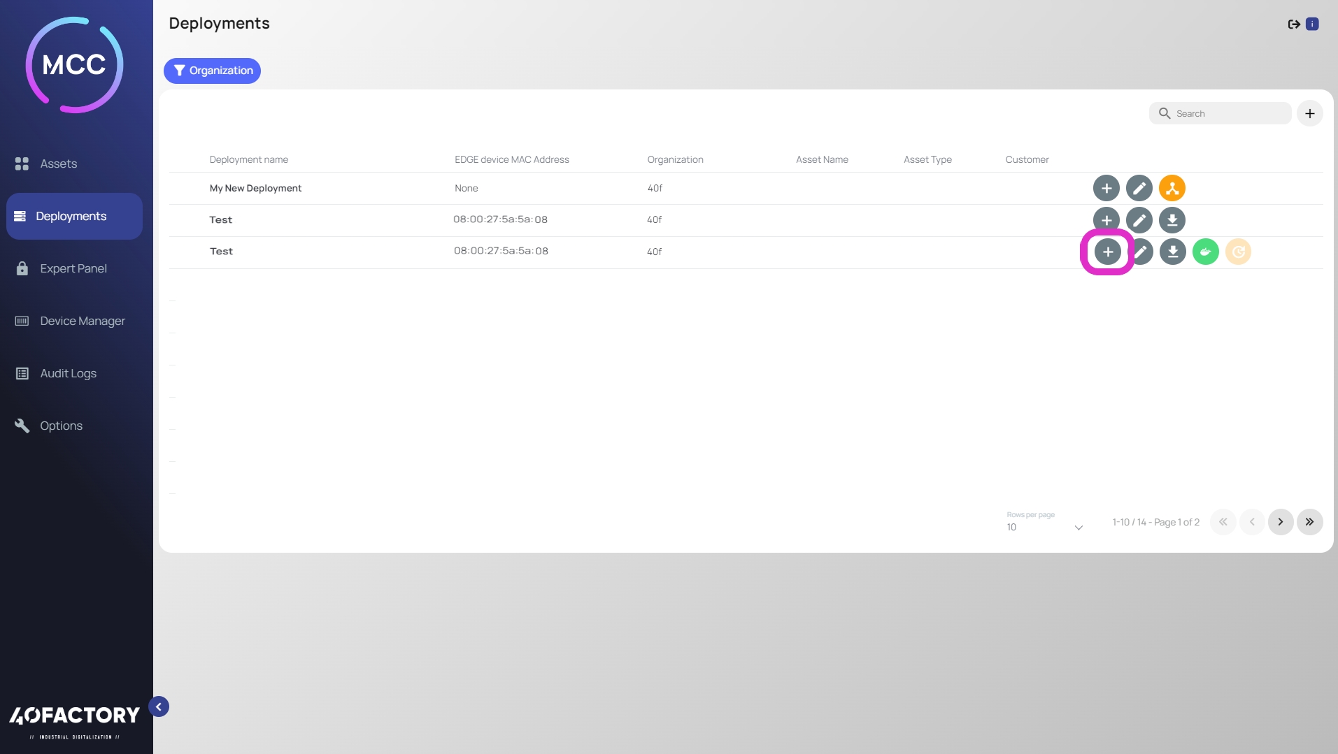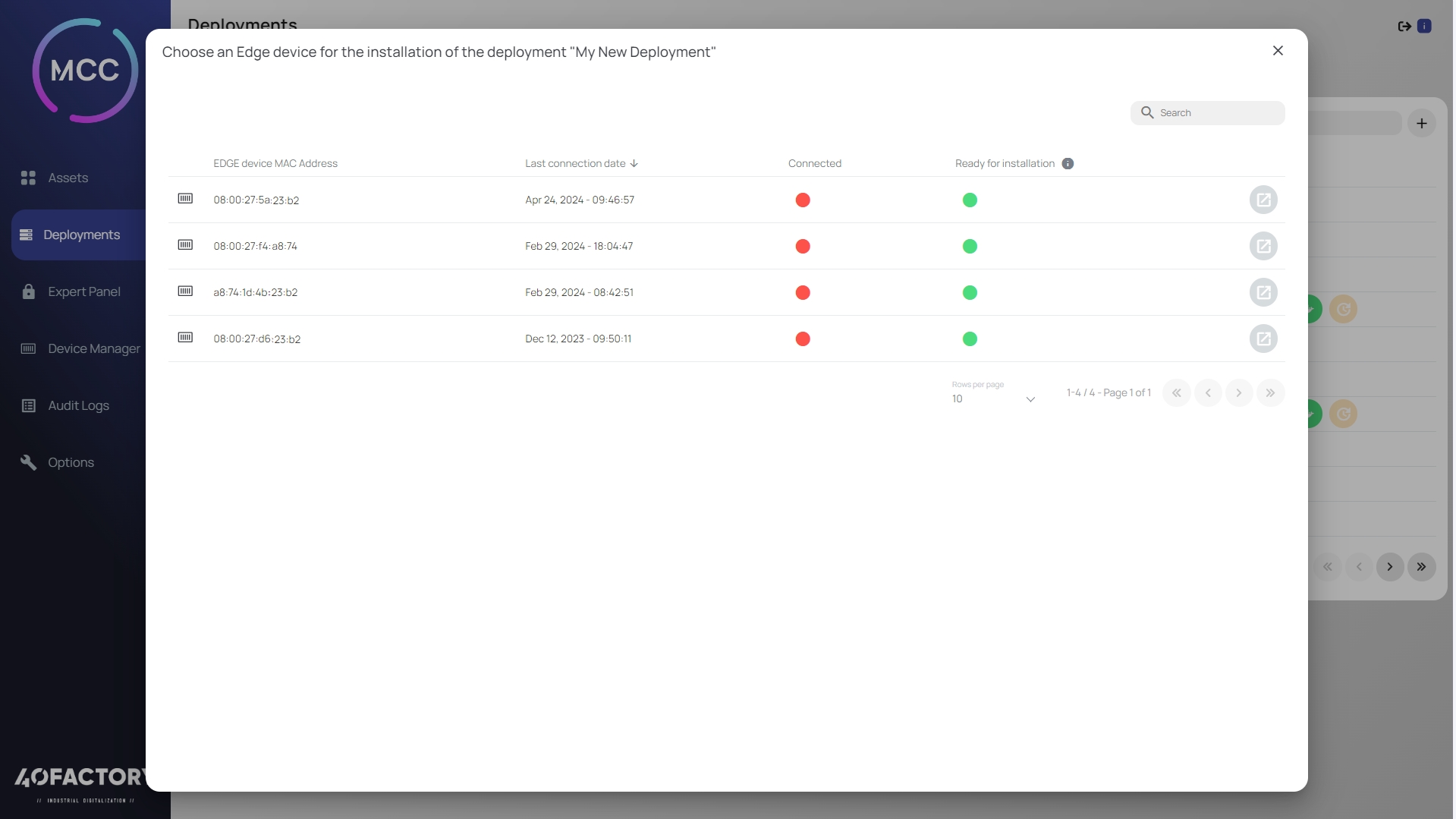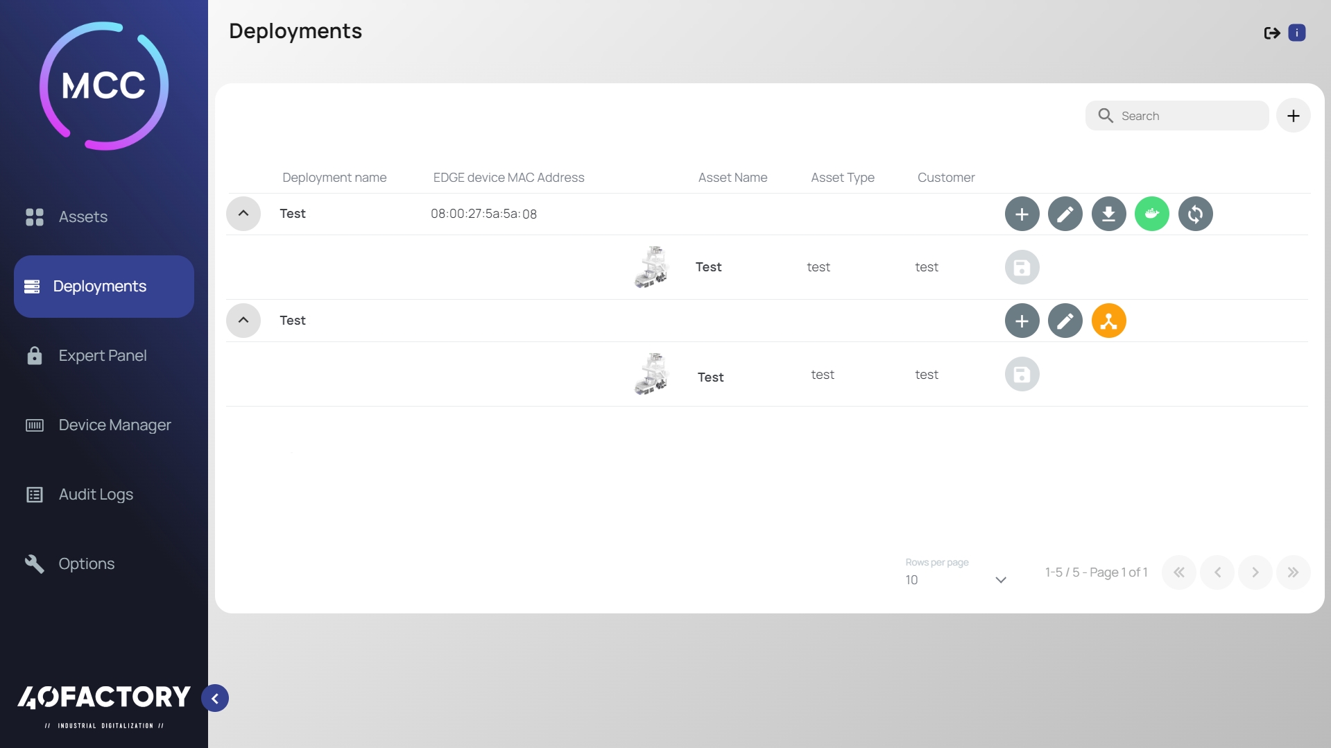 All'interno dell'applicazione MAT Control Center è disponibile questa sezione denominata "Deployments". L'obiettivo della pagina è permettere la realizzazione dei deployment sui dispositivi fisici direttamente da interfaccia grafica, permettendo, inoltre, di avere su un singolo dispositivo Edge più asset differenti.