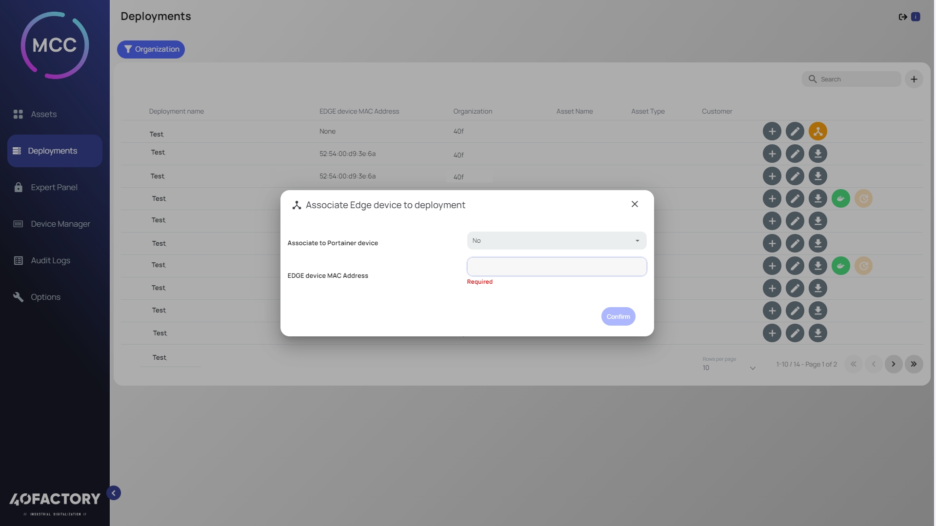Associare un Edge Device al Deployment (Immagine D): grazie a questo tasto è possibile associare al deployment appena creato un dispositivo fisico sul quale dovranno essere caricati i file. L'applicazione permette di scegliere se associare un device tramite Portainer. Scegliendo l'opzione "No" sarà possibile inserire manualmente l'indirizzo MAC del dispositivo (Immagine E), scegliendo invece l'opzione "Si" si verrà riportati su una schermata in cui sono presentati tutti i device disponibili (Immagine F e Immagine G);
