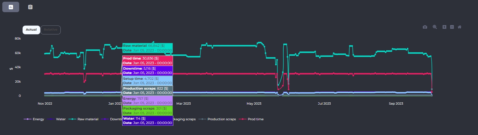Nella parte inferiore della schermata viene visualizzato un grafico che mostra l'andamento nel tempo del costo di ogni consumabile. La granularità del grafico è determinata dall'aggregazione temporale precedentemente scelta. Muovendo il cursore sul grafico è possibile visualizzare, per ogni traccia, un fumetto di dettaglio.