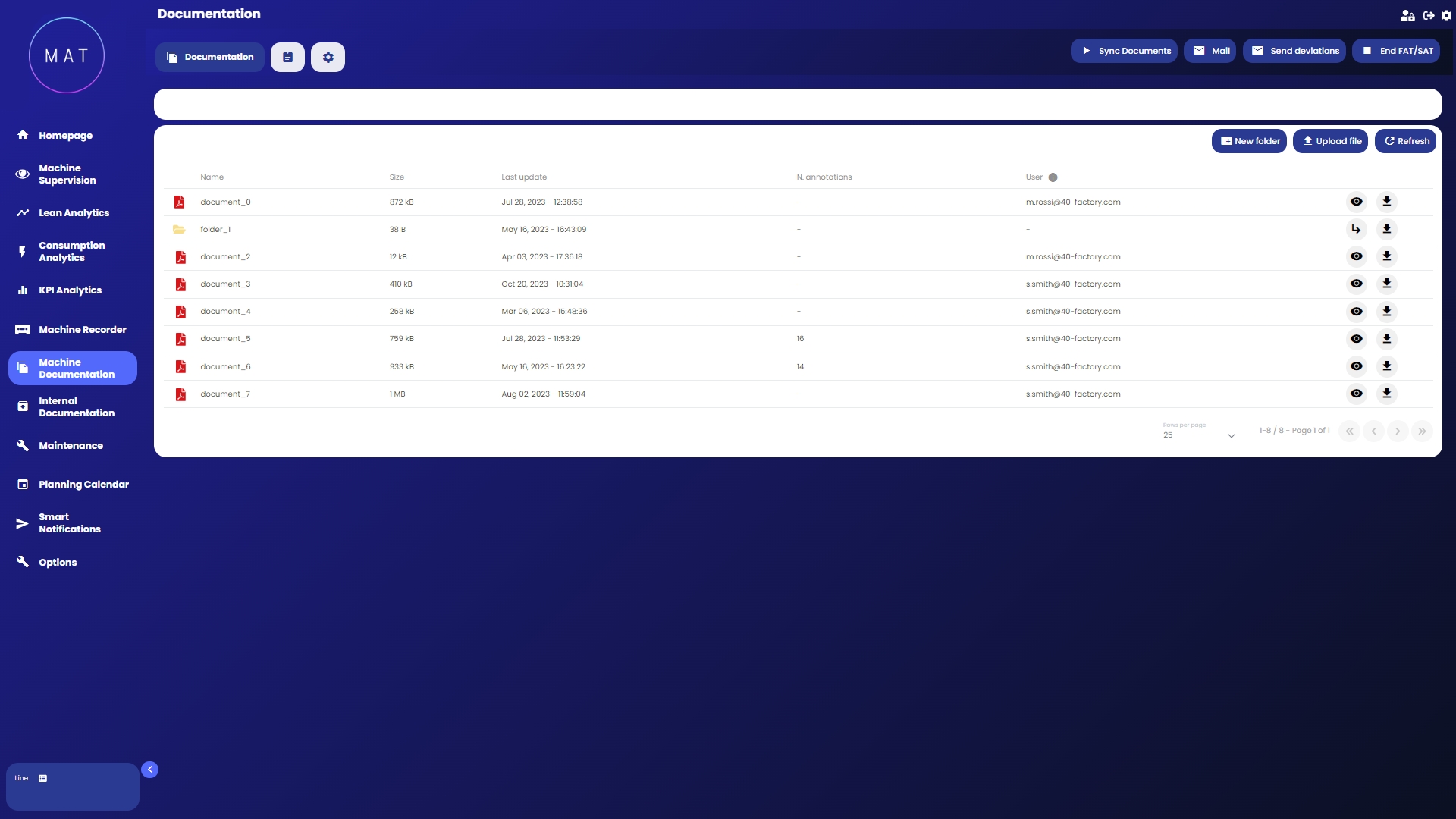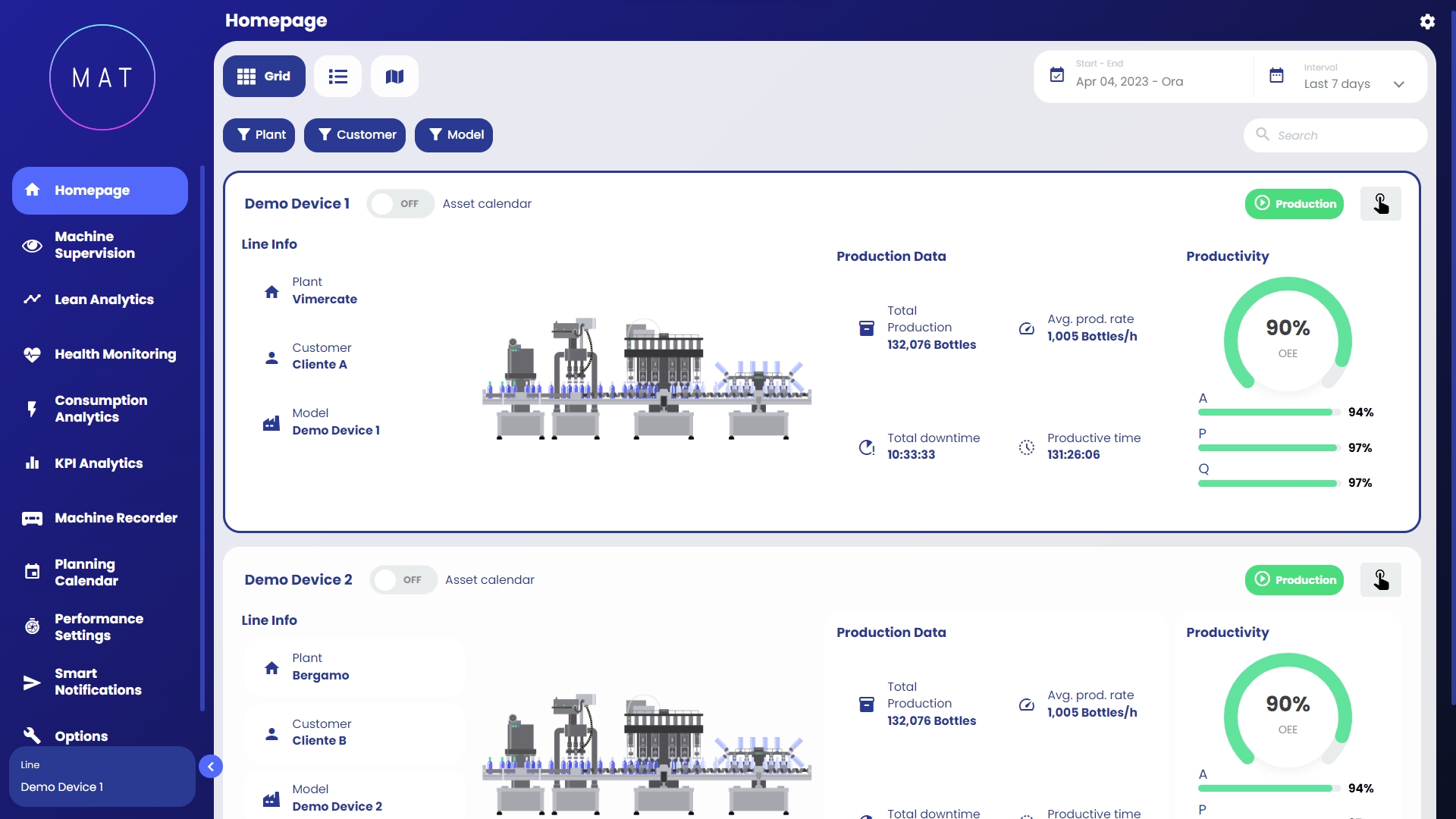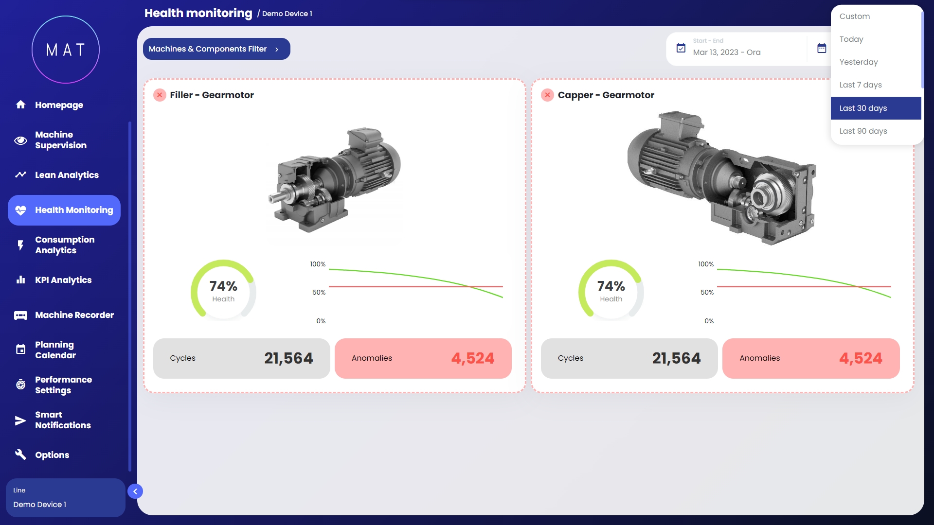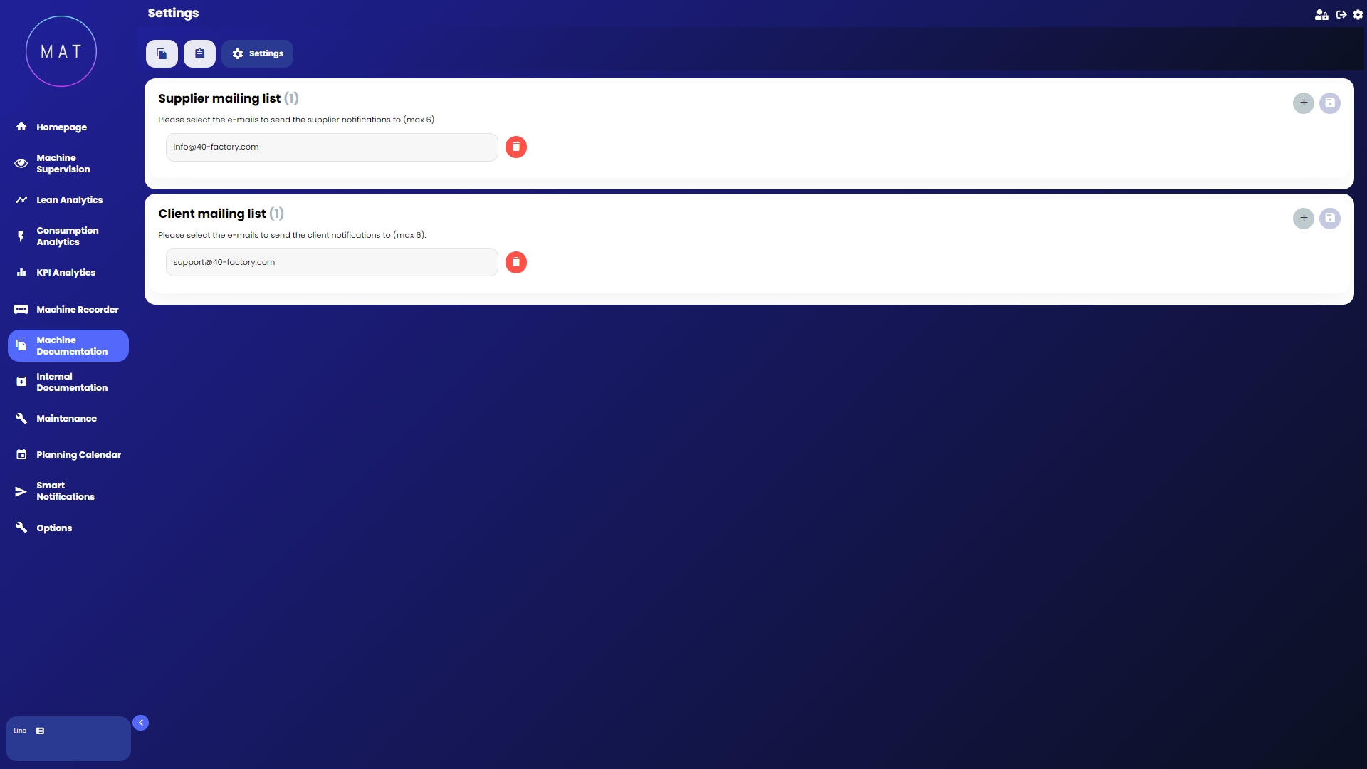 MAT - Machine Analytics Tool di 40Factory è la soluzione Industrial AIIoT (Artificial Intelligence Internet of Things) per la gestione dei diversi aspetti di macchine e linee connesse, tra cui: