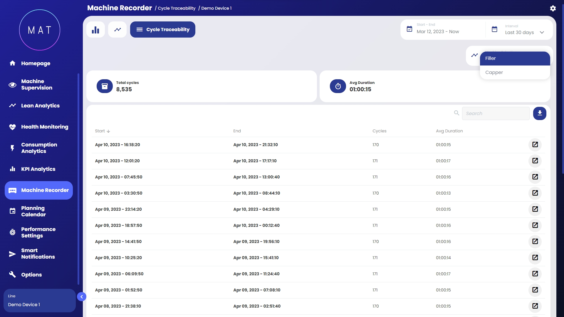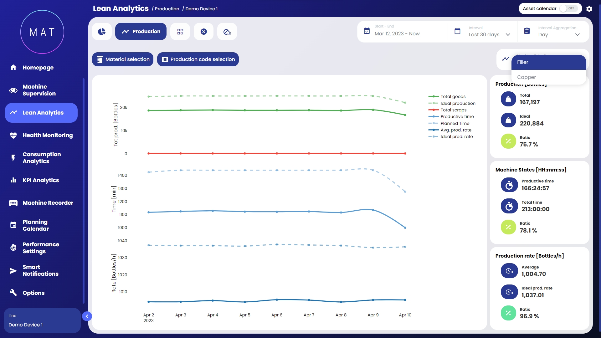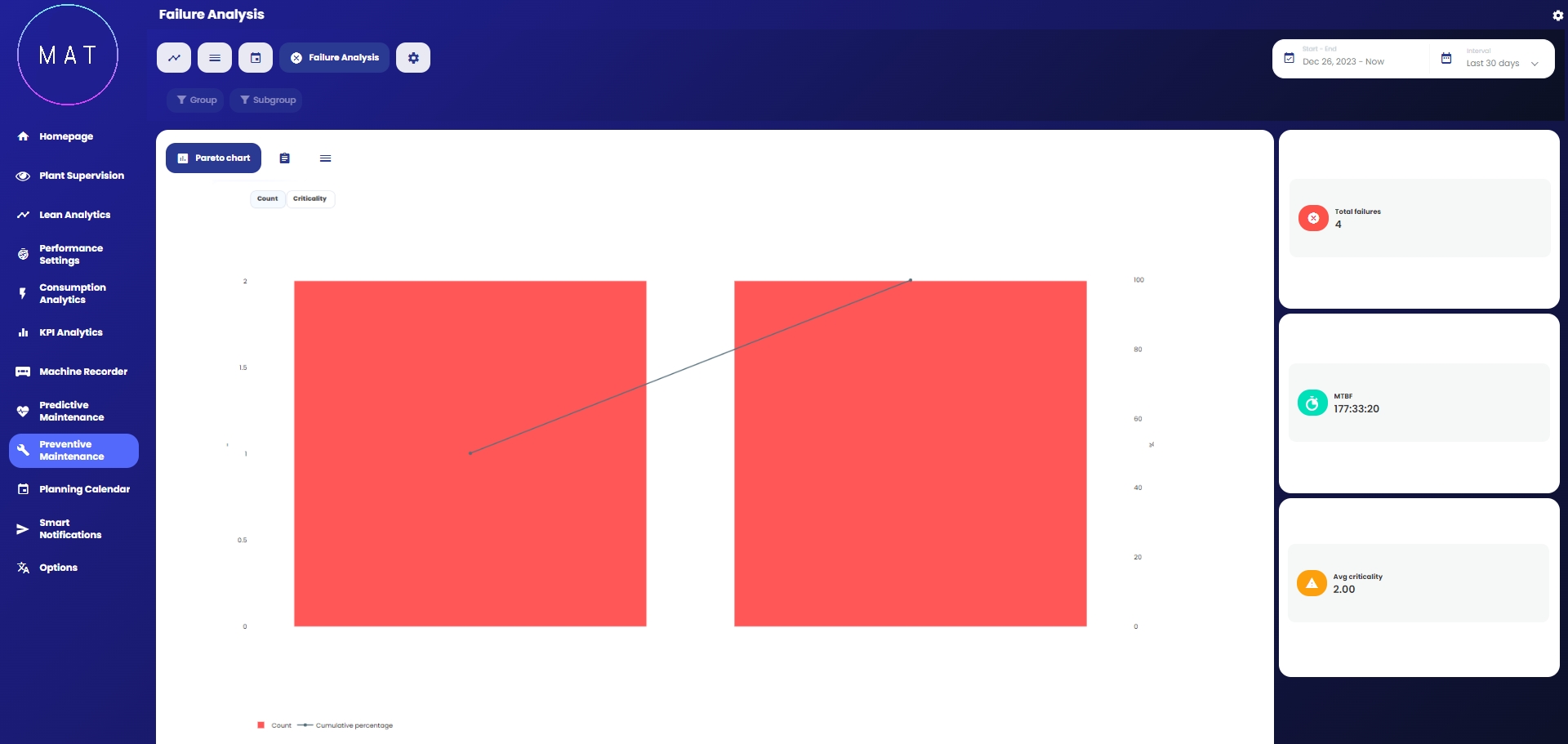MAT - Machine Analytics Tool di 40Factory è la soluzione Industrial AIIoT (Artificial Intelligence Internet of Things) per la gestione dei diversi aspetti di macchine e linee connesse, tra cui: