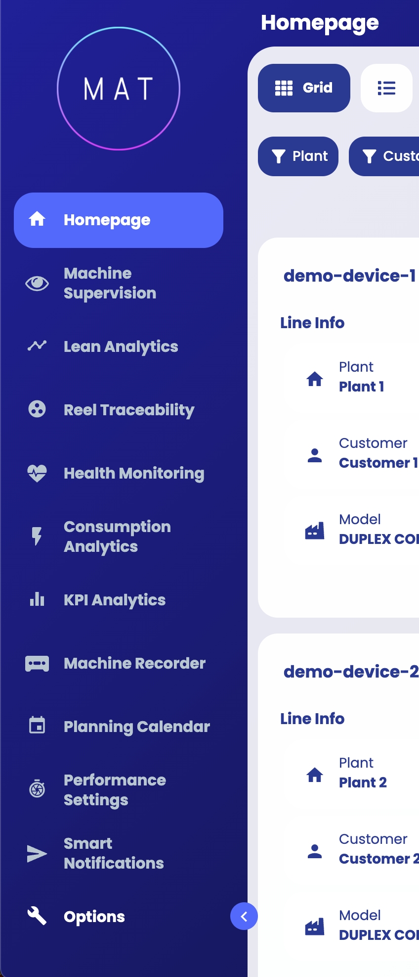 MAT consiste in una Web App HTML5 suddivisa in moduli, ciascuno avente una funzione specifica, accessibile tramite connessione a rete LAN dell’IPC EDGE e/o tramite autenticazione alla piattaforma Cloud sottostante (quando prevista).