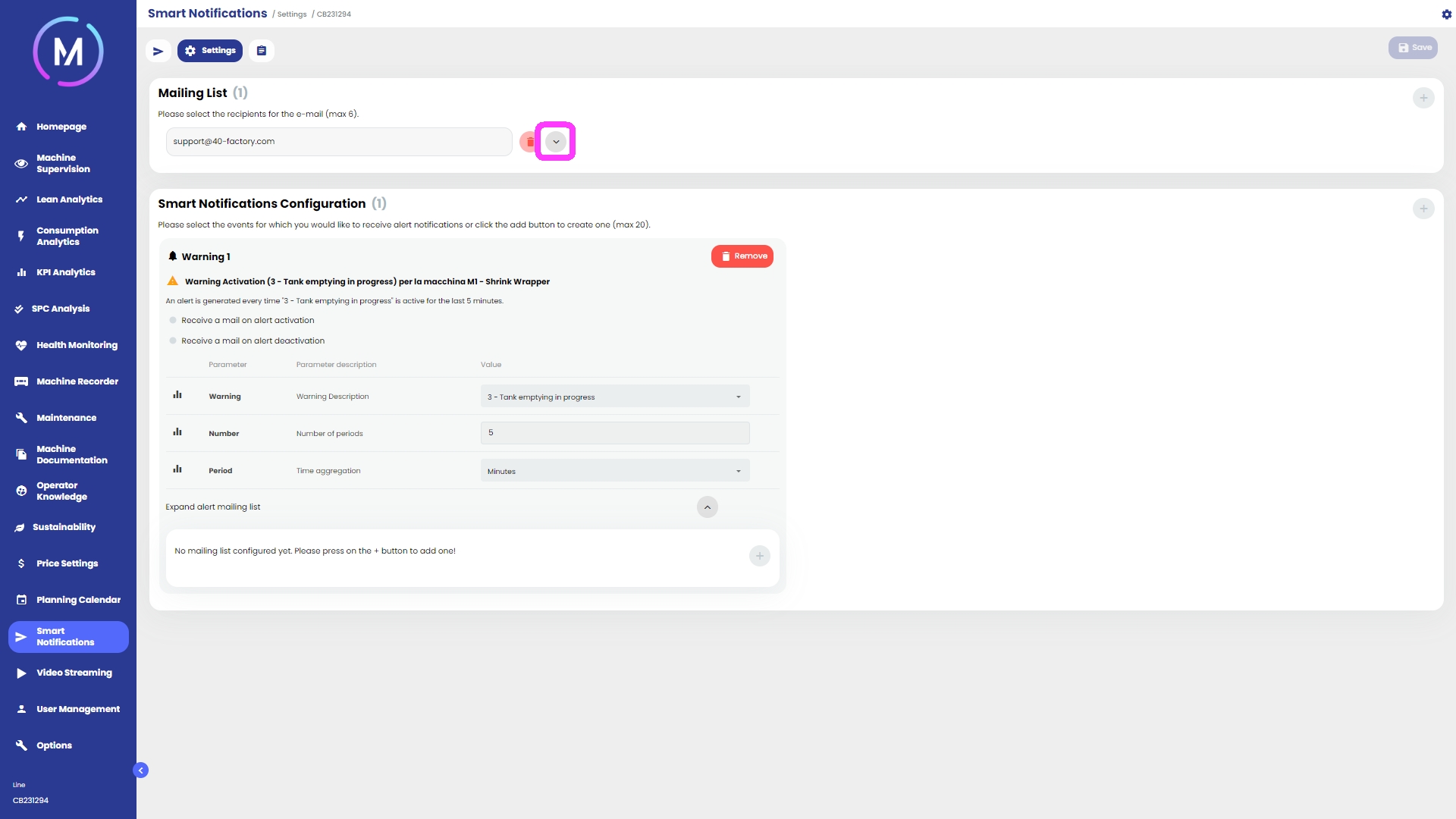 Inoltre, l’integrazione con l’ulteriore modulo "Notifiche Smart" consente di inviare tramite e-mail avvisi automatici al verificarsi di condizioni critiche relative allo stato manutentivo dei componenti di macchine/impianti connessi.
