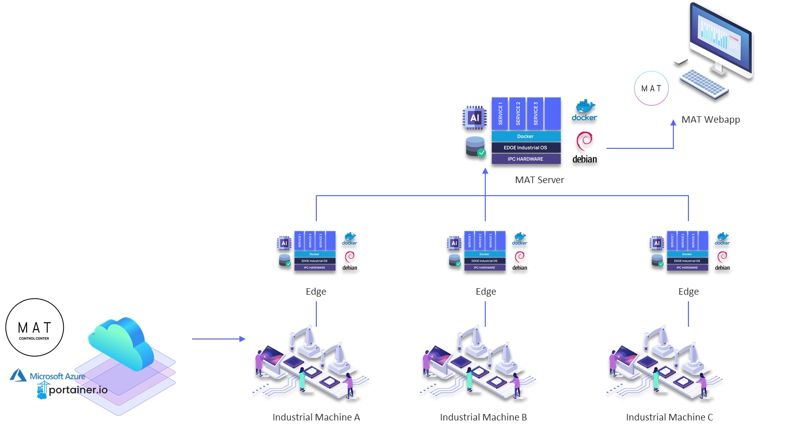 MAT è una soluzione avanzata che sfrutta un set di microservizi Docker per gestire l'intero flusso di acquisizione, elaborazione, archiviazione e visualizzazione dei dati provenienti da macchine industriali. Questa architettura flessibile permette di adattarsi a diverse esigenze operative attraverso varie configurazioni, tra cui soluzioni full-edge e combinazioni di edge e cloud.