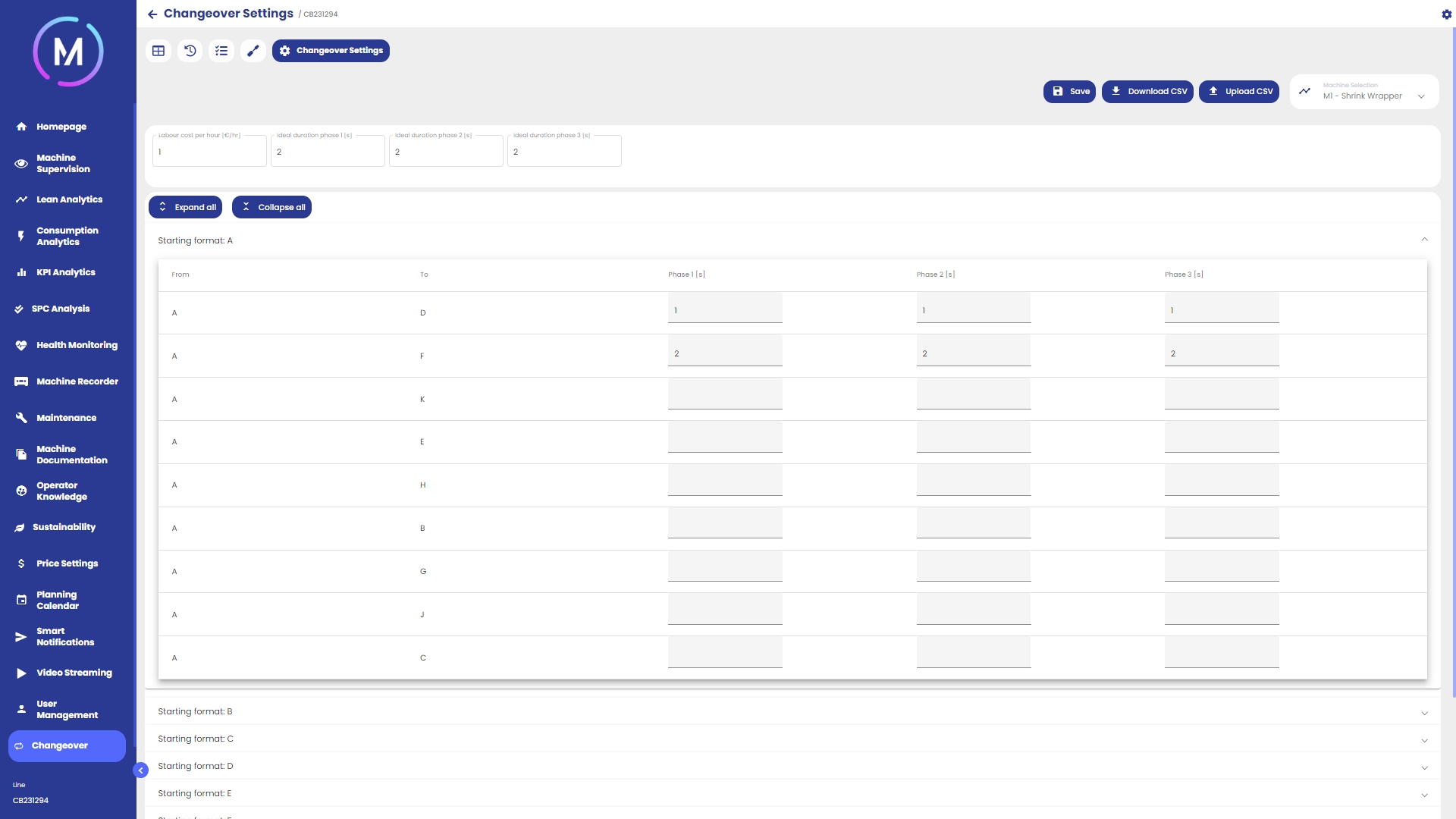 Questa pagina può essere utilizzata per analizzare i tempi necessari per effettuare delle transizioni fra una certa impostazione ed un'altra impostazione della macchina selezionata. Ci si riferirà a queste impostazioni come a dei "formati".
