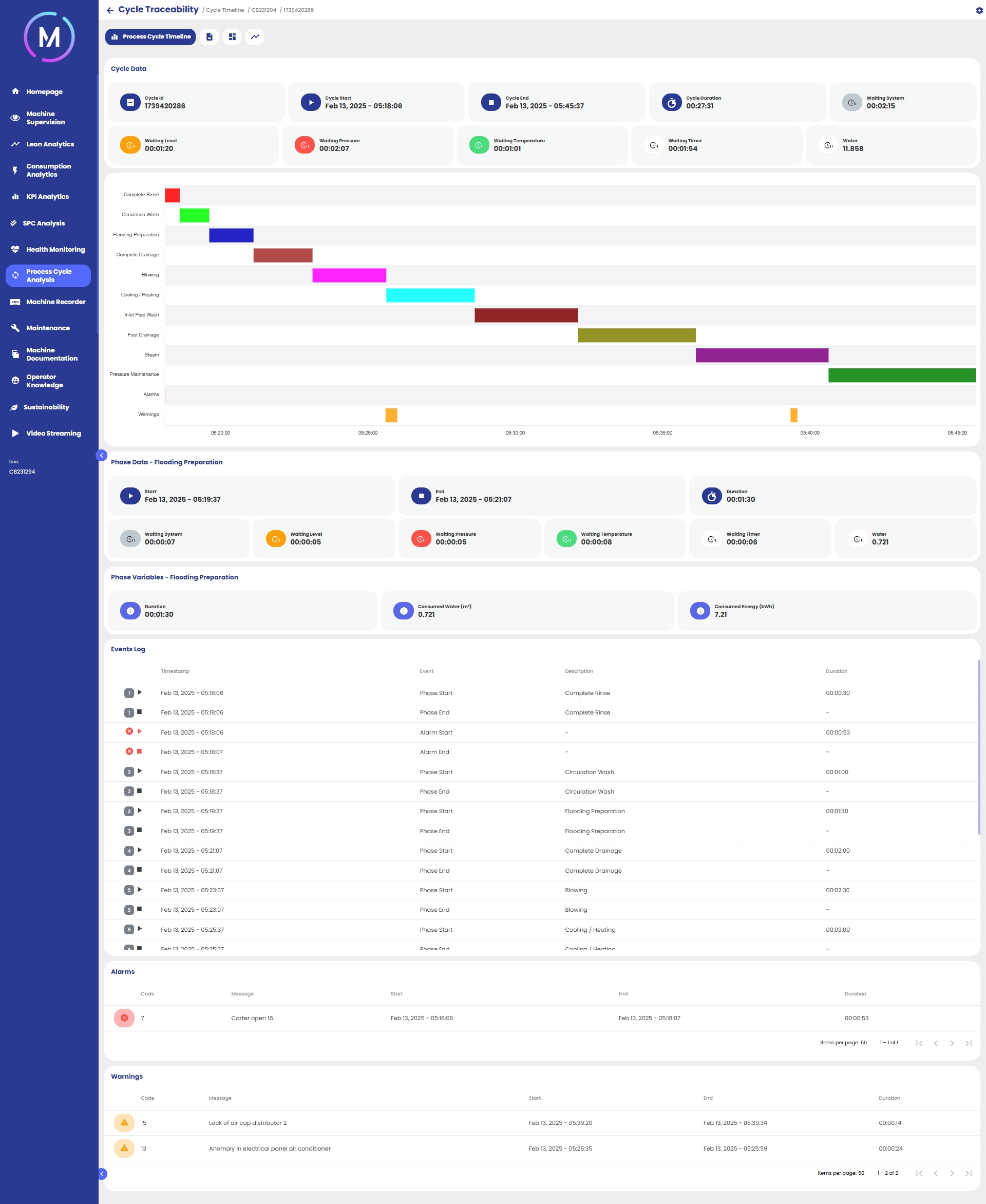 Nella parte superiore della pagina vengono mostrate informazioni generali sul ciclo, tra cui il suo identificativo, l’orario di inizio e fine, la durata complessiva, i tempi impiegati suddivisi per tipologia e la quantità di prodotti utilizzati.
