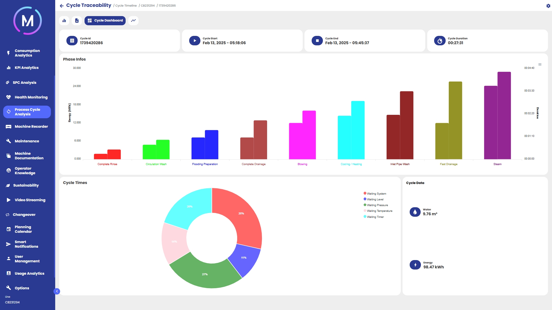 La sezione Dashboard Cicli presenta una schermata contenente informazioni utili per l'analisi di un ciclo e delle sue fasi. Nota che, rispetto alla sezione Timeline Ciclo di Processo, in questa sezione si vuole analizzare il ciclo nella sua globalità, senza soffermarsi sul preciso ordine in cui le fasi si sono susseguite. L'analisi si concentra sulla tipologia delle diverse fasi, piuttosto che sulle loro occorrenze. Questa dashboard è configurabile, permettendo agli utenti di personalizzare la visualizzazione dei dati in base alle proprie esigenze per l'analisi del ciclo della macchina.