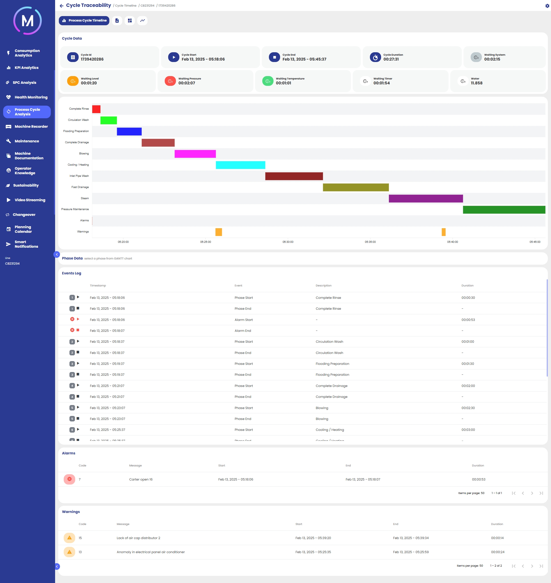 Nella parte superiore della pagina vengono mostrate informazioni generali sul ciclo, tra cui il suo identificativo, l’orario di inizio e fine, la durata complessiva, i tempi impiegati suddivisi per tipologia e la quantità di prodotti utilizzati.