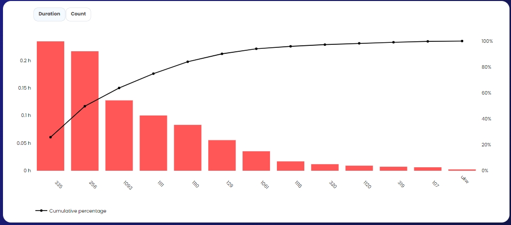 in basso a sinistra è presente un grafico a pareto che rappresenta i fermi della macchina nell'intervallo di tempo selezionato;