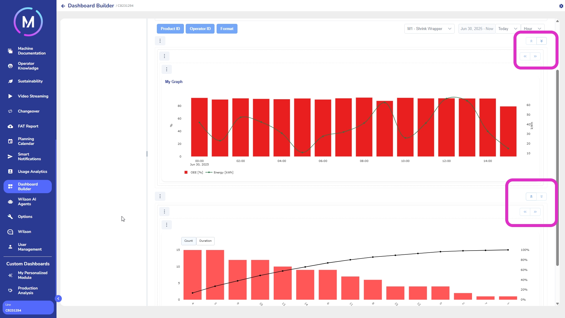 drop-down della sotto macchina: visibile solo nei progetti multi-macchina, permette di selezionare l’entità da analizzare;