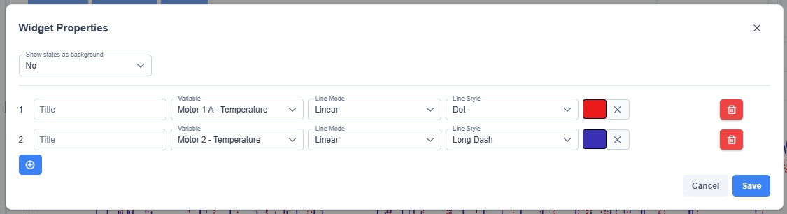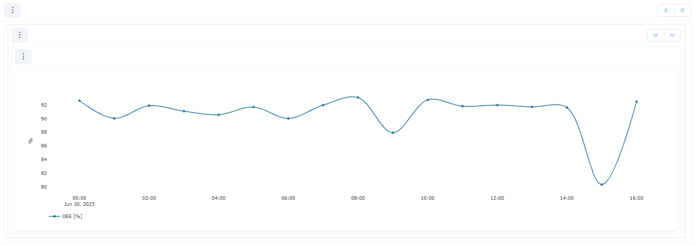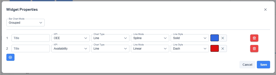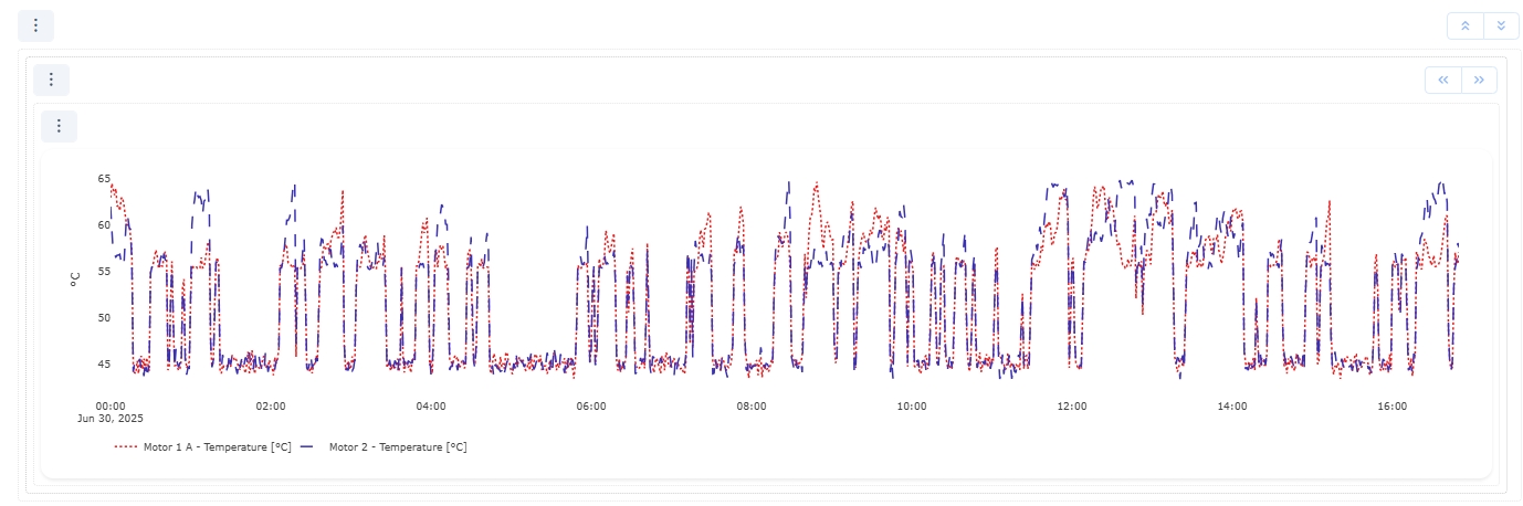 Questo componente permette di visualizzare un grafico con una o più tracce riportate. Nella finestra di configurazione è possibile configurare le varie tracce da mostrare e il loro aspetto grafico. Nota che i dati visualizzati sono i KPI disponibili per l'asset nel tempo.