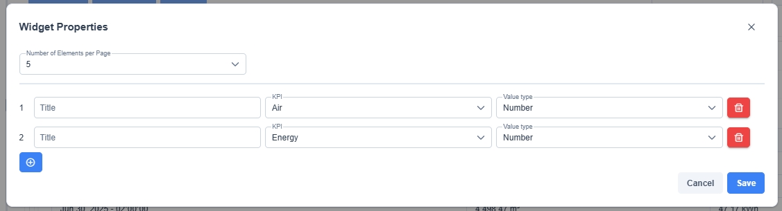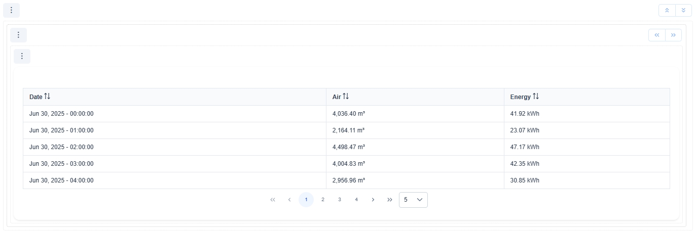 Una tabella permette di visualizzare un KPI in formato tabellare. Ogni riga rappresenta un intervallo temporale in cui viene visualizzato il dato. Il resample temporale dipende da come è configurata la pagina nell'intestazione della tabella. La finestra di configurazione permette di configurare i KPI da mostrare nelle varie colonne e il numero di righe.