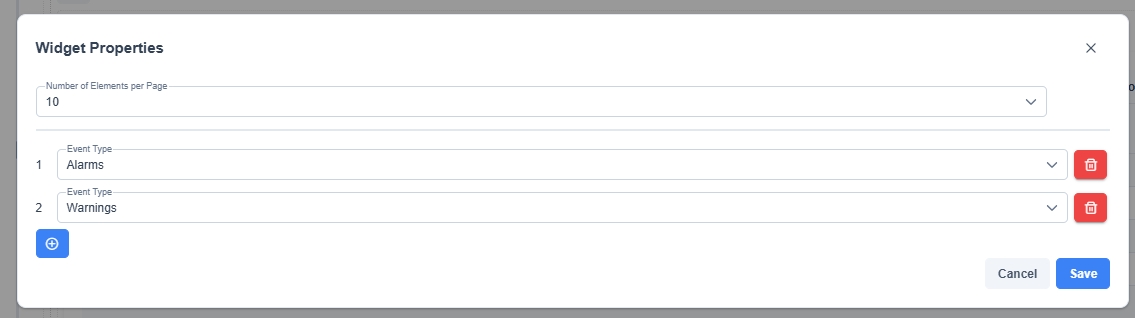 Questo widget permette di inserire una tabella di eventi del tipo selezionato. La finestra di configurazione permette di scegliere la tipologia di evento da considerare e il numero di righe da mostrare. Possono anche essere configurati più tipi di evento da mostrare.