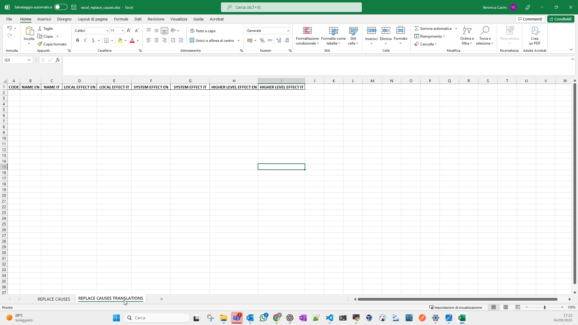 La colonna CODE deve contenere il codice univoco della causa per la quale si vogliono specificare le traduzioni. Nota che il contenuto di questa colonna deve coincidere con il contenuto della colonna CODE nella tab REPLACE CAUSES.