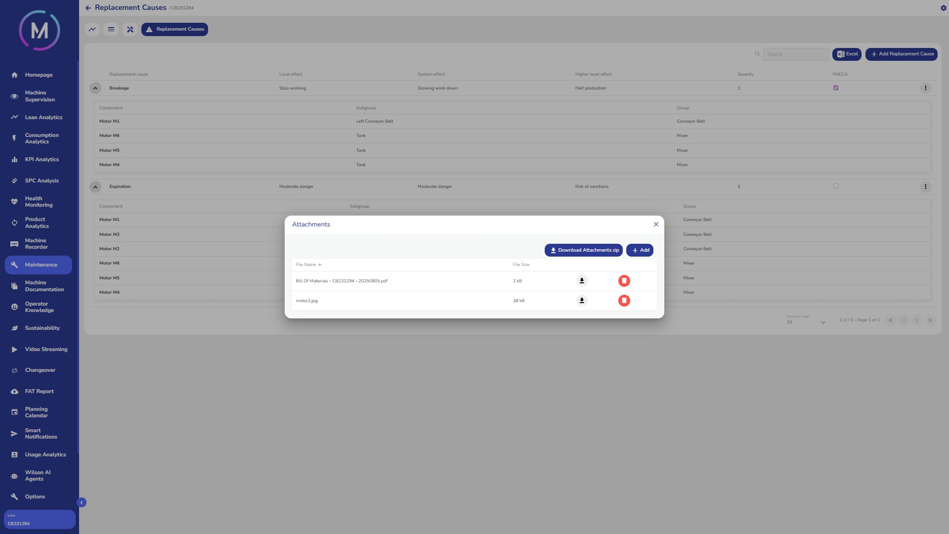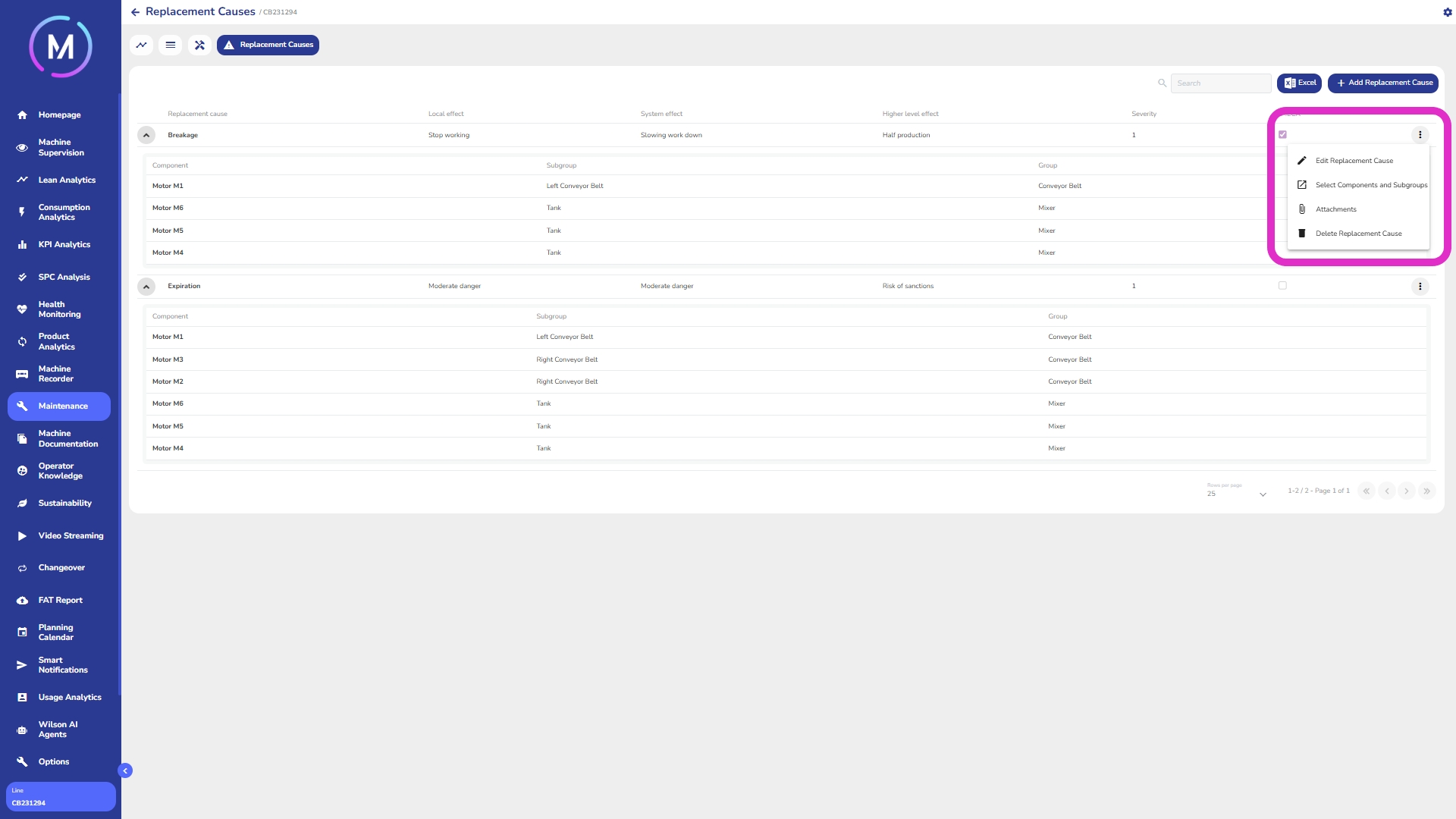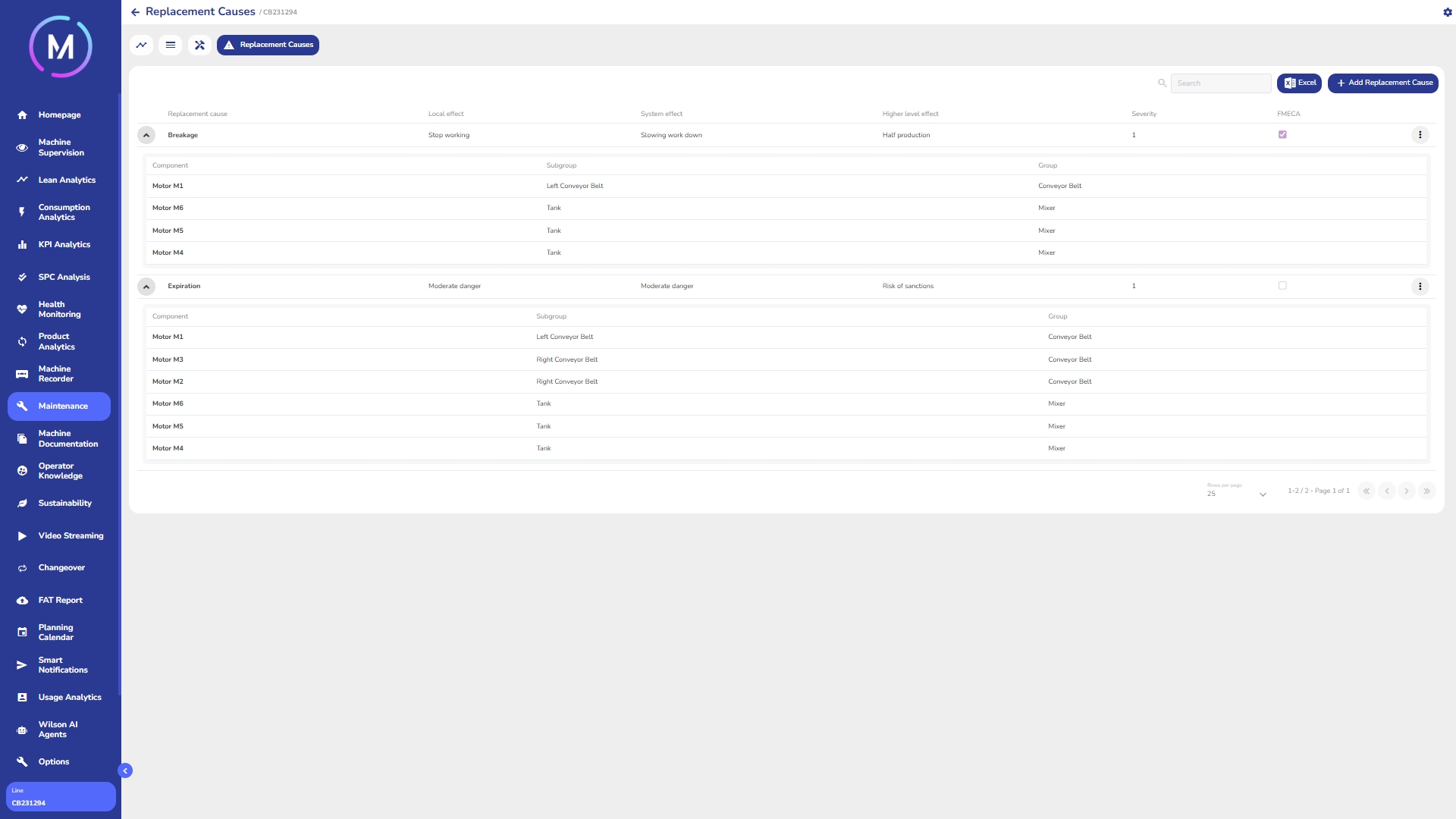 In questo modulo è possibile visualizzare tutte le Cause di Sostituzione registrate per l'asset corrente. Ogni causa può essere associata a componenti o sottogruppi. Quando si effettuerà una manutenzione, la causa di sostituzione sarà applicabile solo ai componenti ai quali è associata.