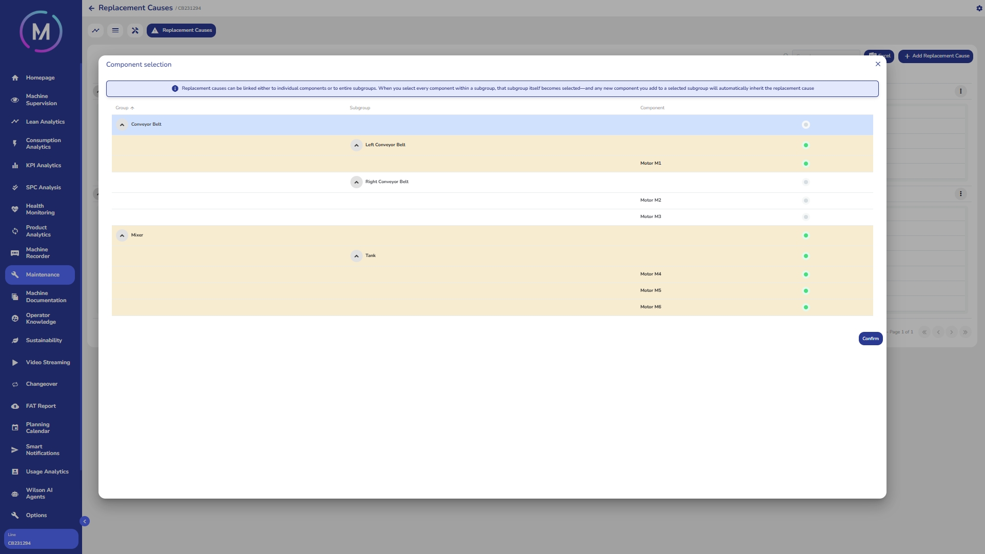 Selezionando un componente, solo tale oggetto sarà legato alla Causa di Sostituzione, mentre se si seleziona un interno sottogruppo, tutti i componenti che ne fanno parte all'istante corrente e nel futuro saranno automaticamente associati alla causa.