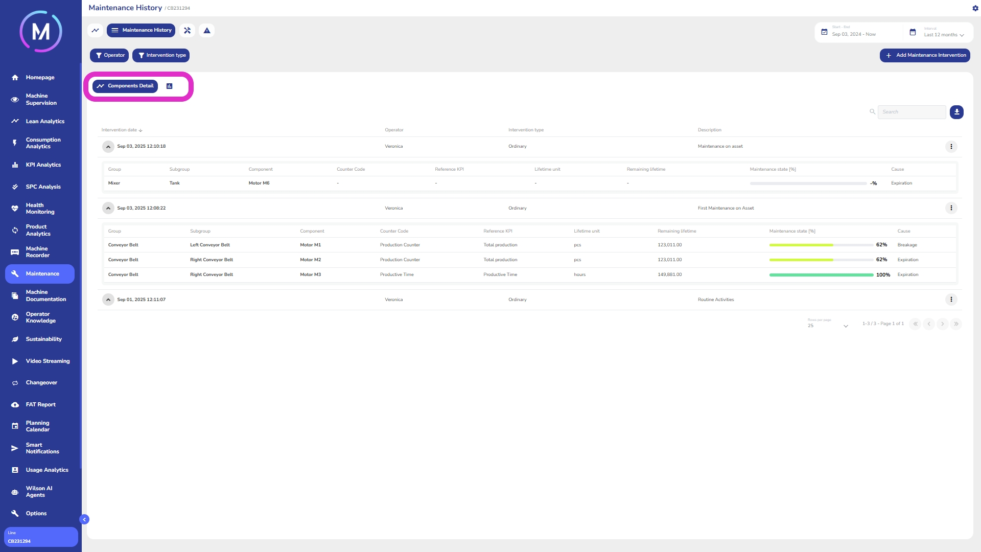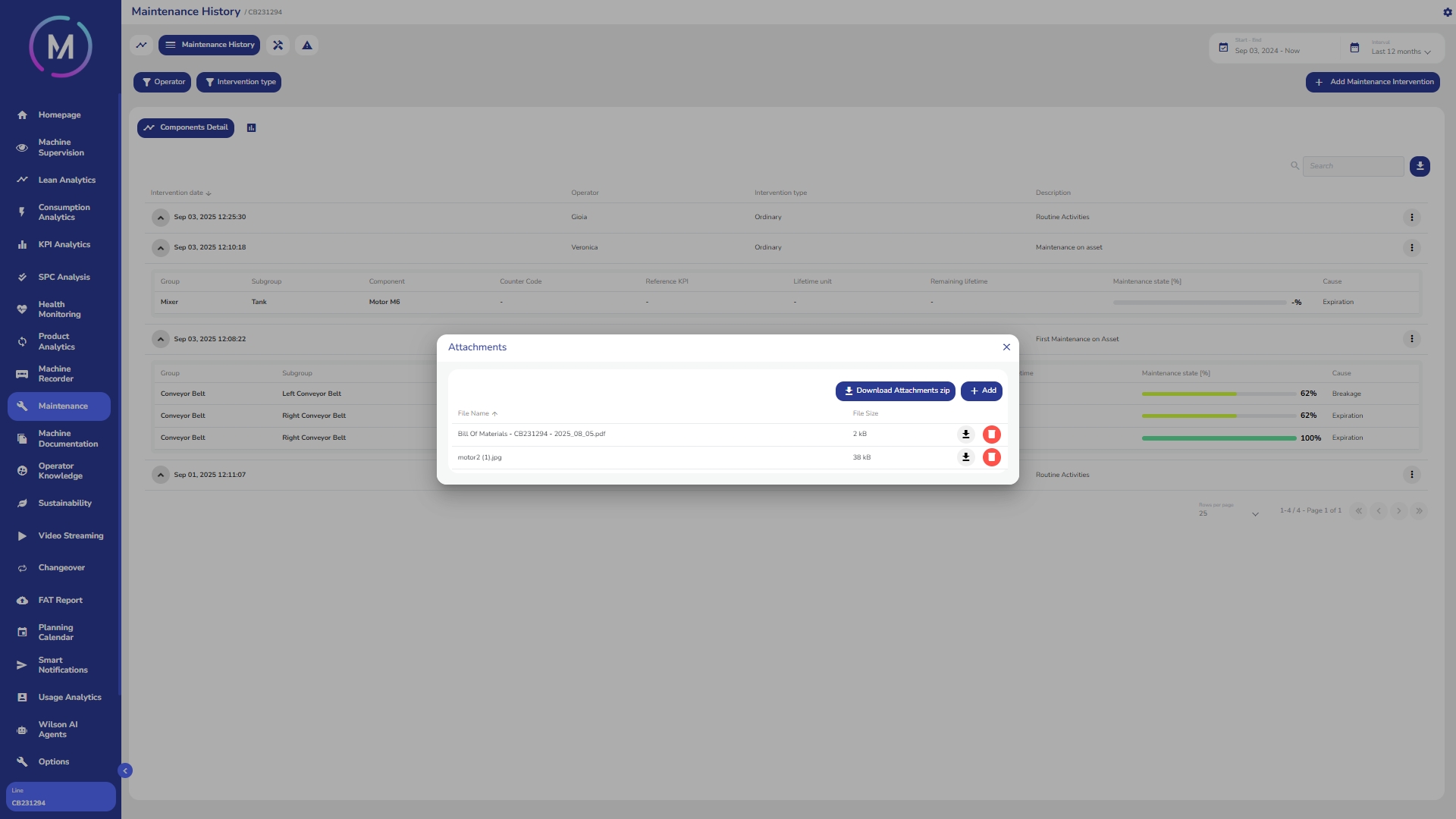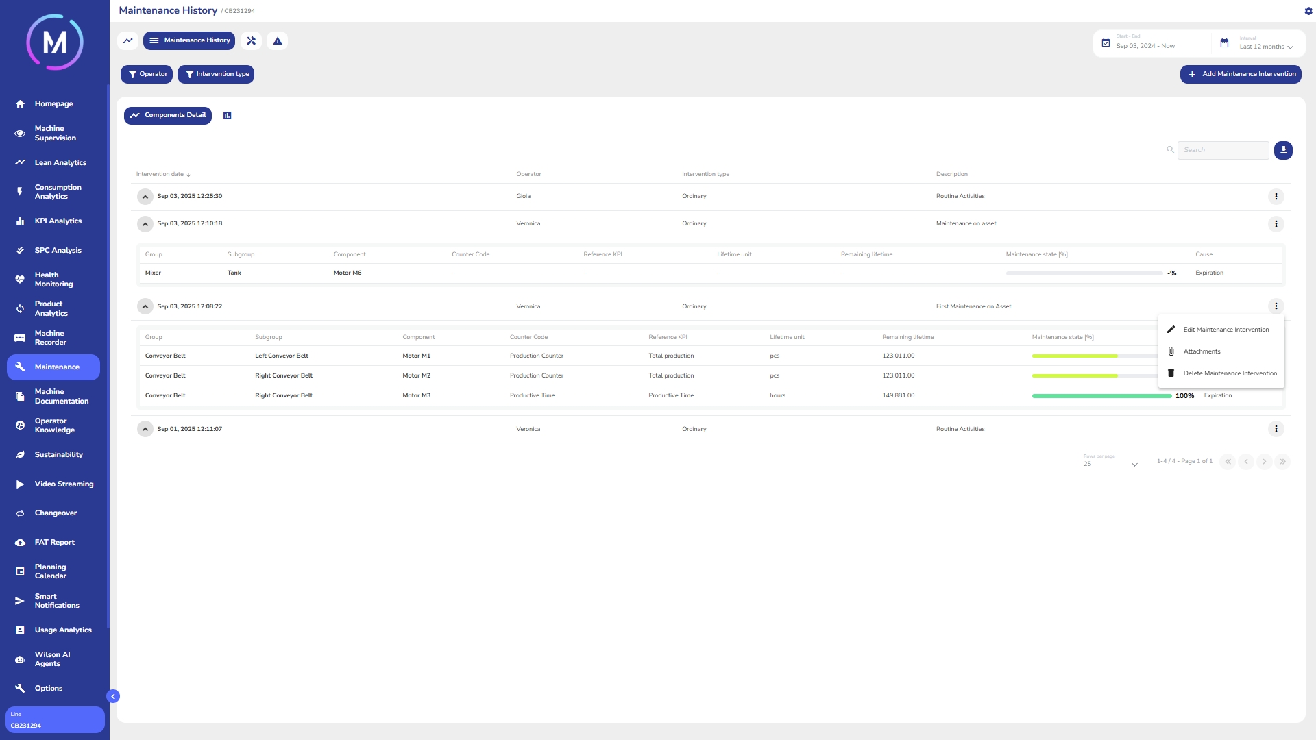 In questa sezione si può visualizzare lo storico di tutti gli interventi manutentivi avvenuti. Infatti, ogni riga dell'elenco corrisponde ad una manutenzione.