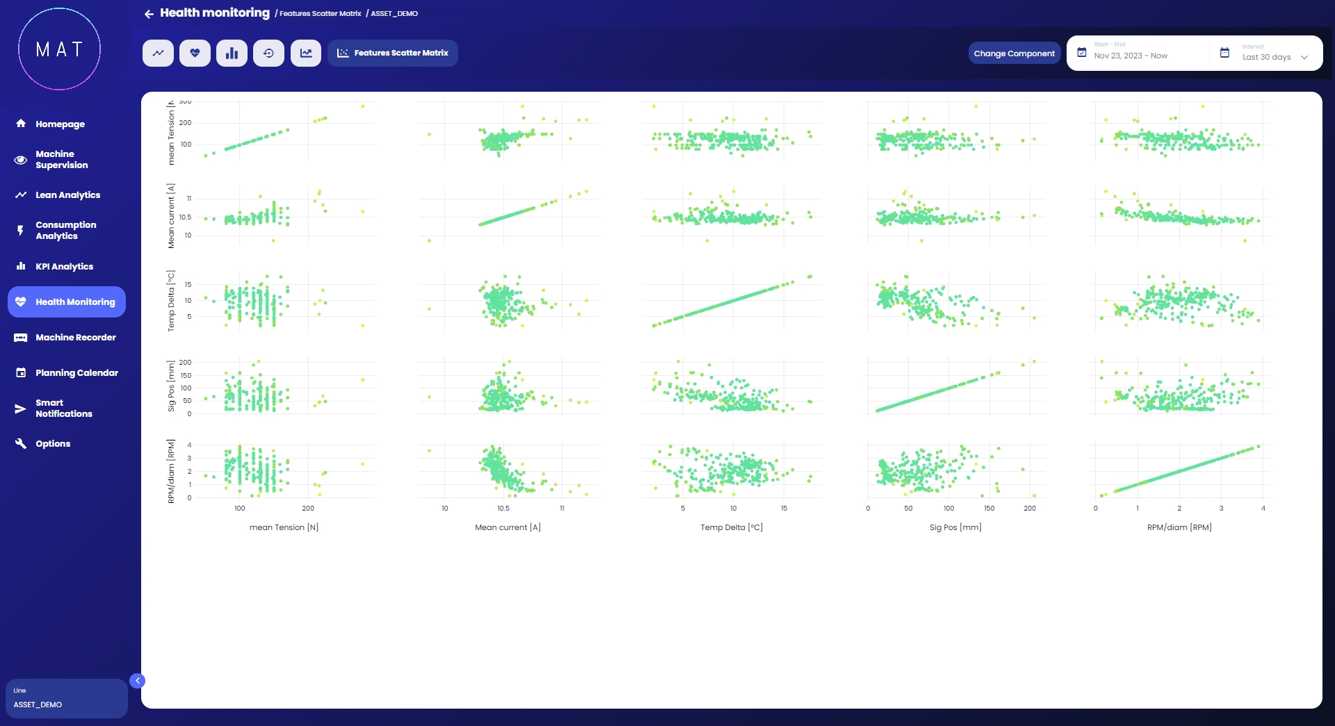 In questa pagina è possibile visualizzare, per il componente selezionato, una serie di matrici scatter che mettono in relazioni tutte le variabili descrittive di un componente fra loro. In questo modo è possibile apprezzare il legame che ogni variabile presenta rispetto alle altre ed è possibile effettuare analisi sulla dispersione per meglio comprendere il legame presente fra diversi fattori descrittivi. Ogni punto all'interno della singola matrice rappresenta un'osservazione di dati per le due variabili di competenza del grafico realizzata allo stesso istante.