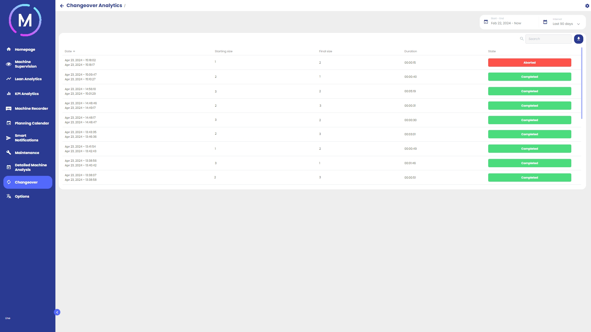 La prima visualizzazione quando si accede al modulo Transizioni presenta lo storico di tutti i cambi. La tabella nel corpo principale della pagina presenta una riga per ogni cambio avvenuto. Oltre ad essere specificato il valore di partenza e il valore finale del parametro in analisi, ovvero i due valori prima e dopo il cambio, viene specificato anche lo stato dell'operazione, che può essere "Completata" oppure "Annullata".
