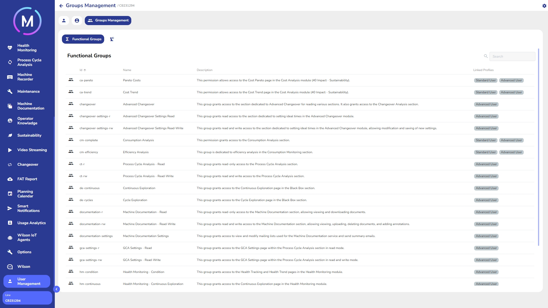 La prima tab, Gruppi, elenca tutti i gruppi funzionali necessari al corretto funzionamento dell’applicazione MAT e alla visualizzazione delle sue pagine. Questi gruppi non possono essere modificati, poiché sono strettamente legati all’applicazione. Per ciascun gruppo vengono mostrate alcune informazioni, come per esempio l’ID, il nome descrittivo, la descrizione e i profili nei quali il gruppo è incluso. Per maggiori informazioni sui gruppi asset, fare riferimento alla documentazione dedicata.