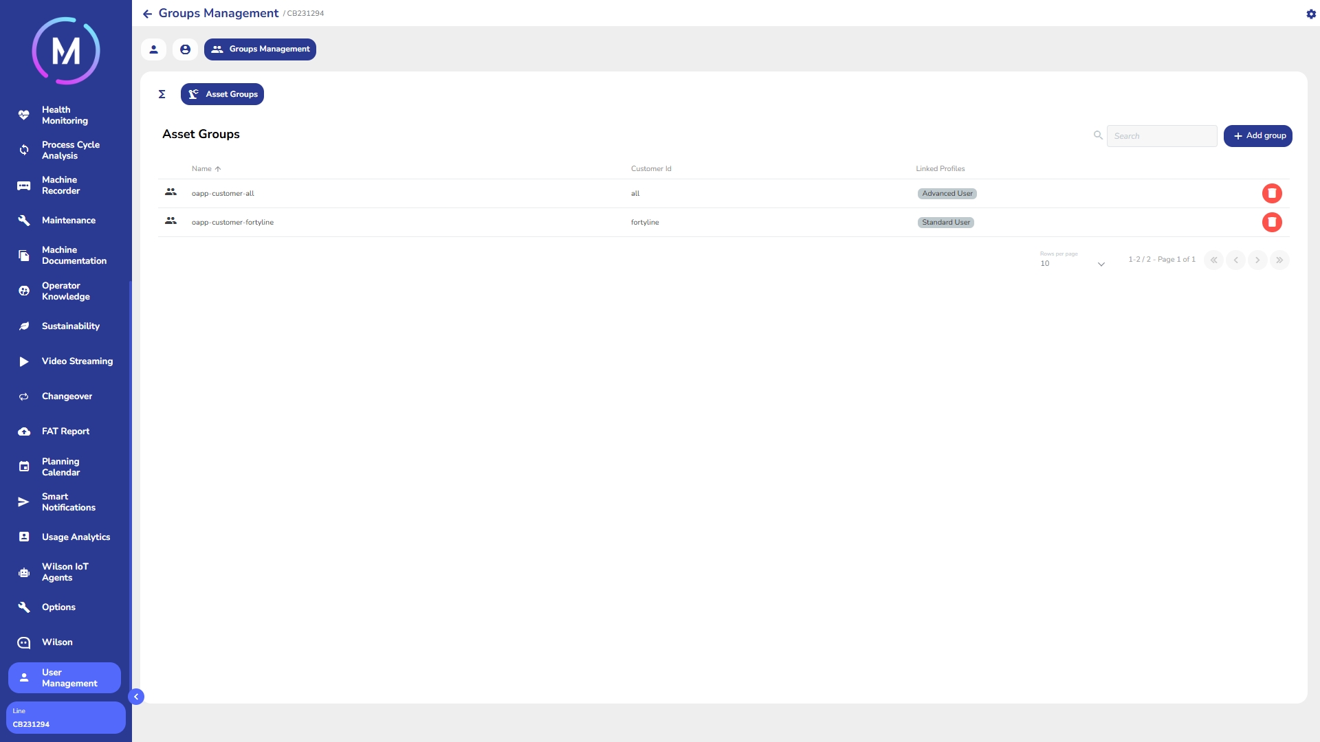 La seconda tab, Gruppi Assets, contiene l’elenco dei gruppi asset, ovvero quei gruppi legati ai permessi di visualizzazione degli asset. Per ogni gruppo sono indicati il relativo Customer ID e i profili ai quali quel gruppo è assegnato. Per maggiori informazioni sui gruppi asset, fare riferimento alla documentazione dedicata.