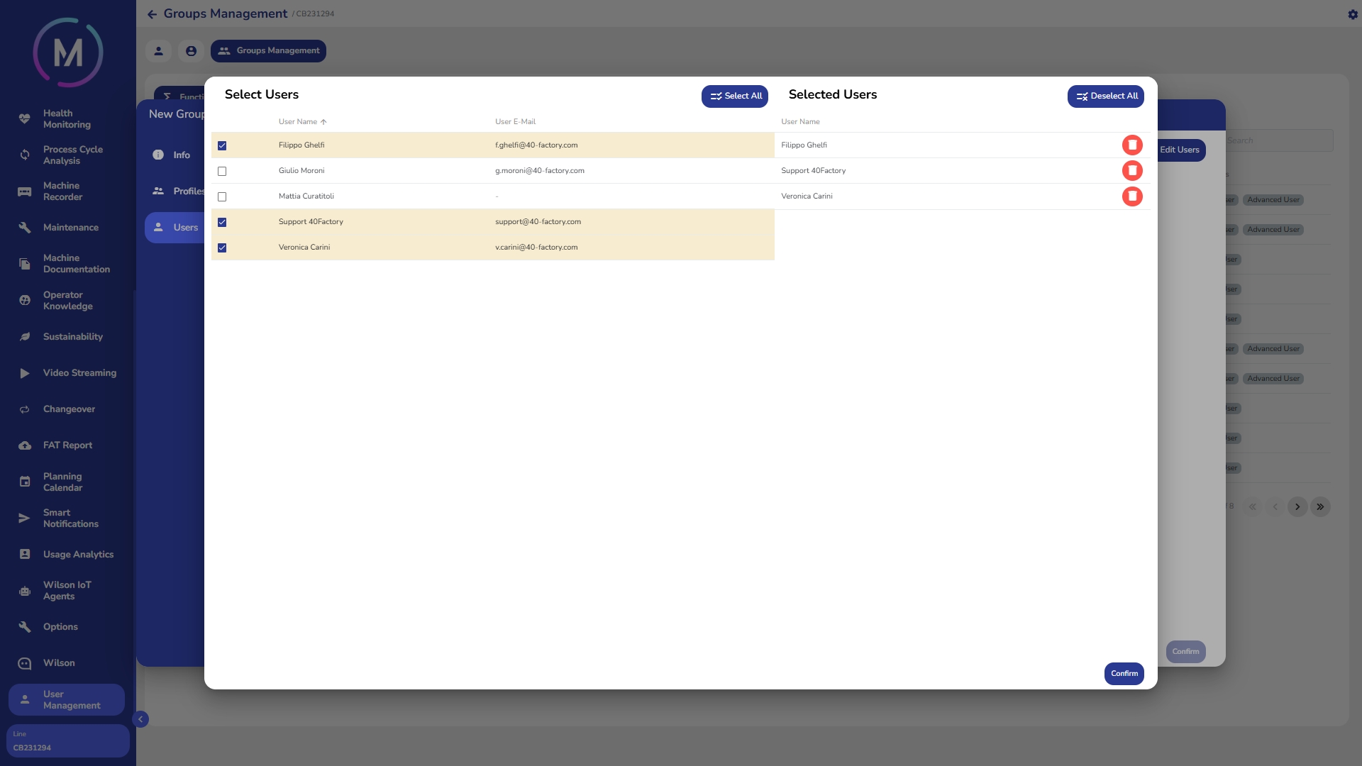 In fase di creazione di un gruppo asset è possibile associarvi alcuni utenti. Per fare ciò si utilizza il tasto Modifica Utenti: si aprirà una sovra finestra con due colonne separate le quali elencano gli utenti esistenti e quelli associati al progetto. Dopo aver selezionato gli utenti ai quali si è interessati è possibile confermare la selezione per vederli visualizzati fra quelli ai quali appartiene il gruppo.