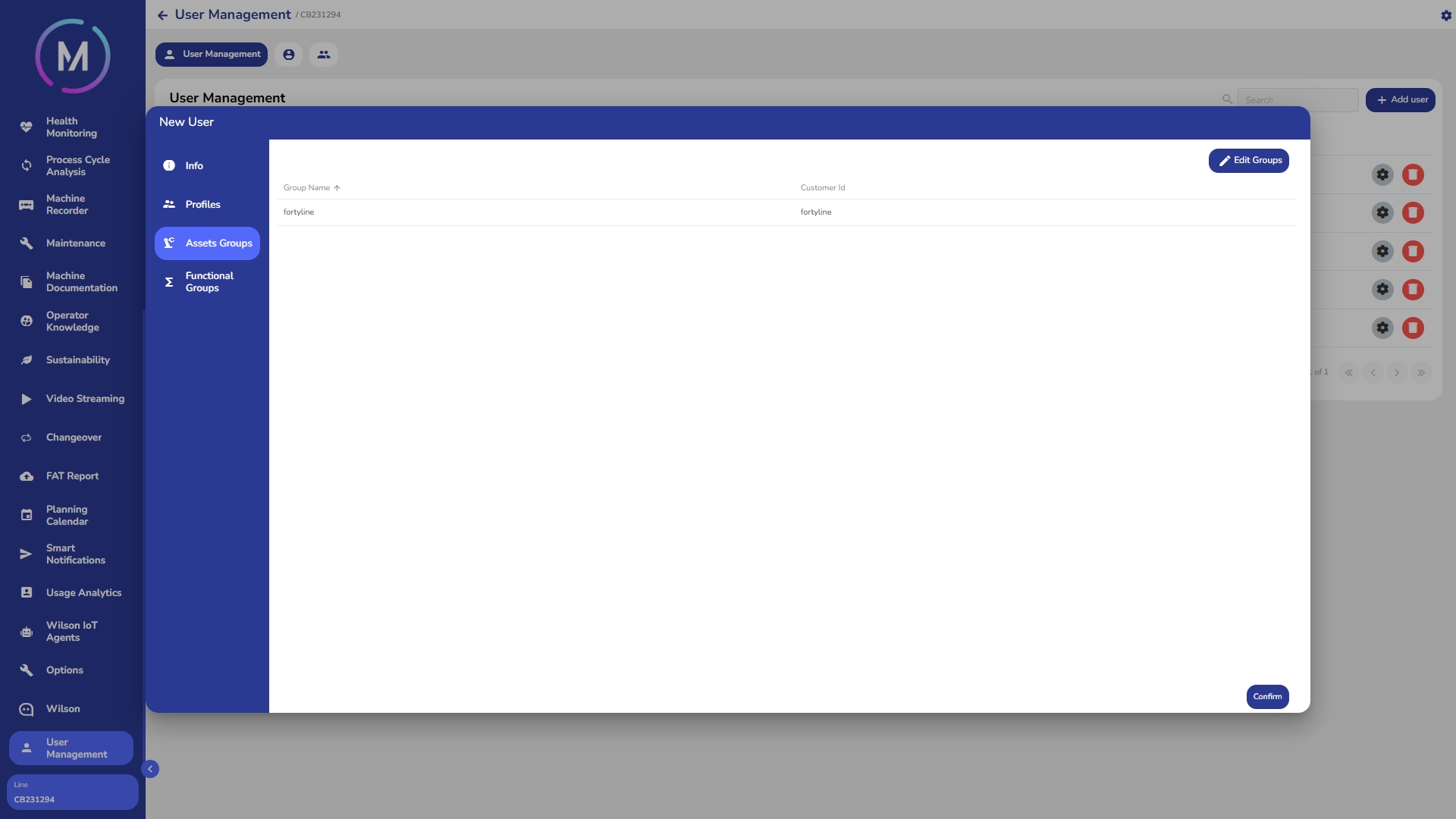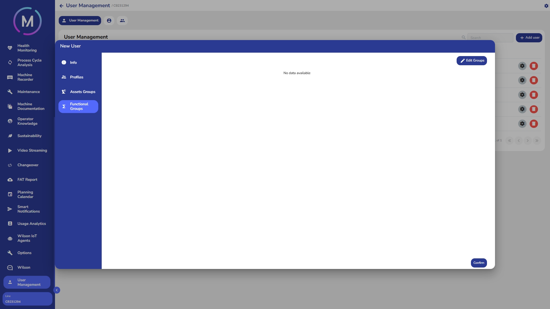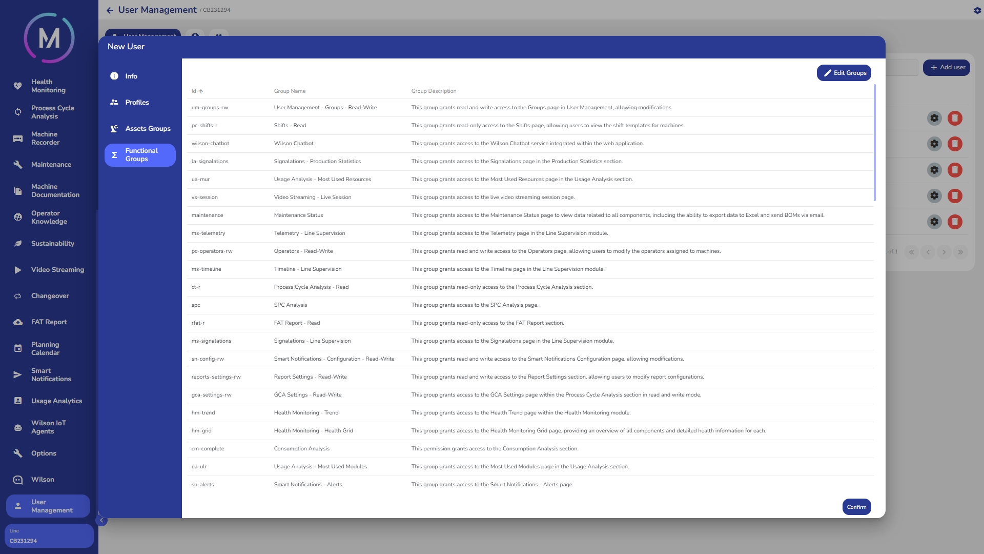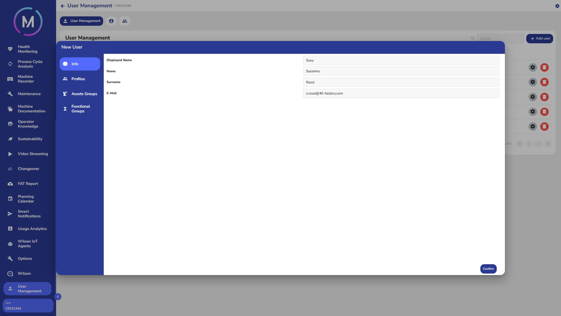 Scegliendo di modificare un utente, si aprirà una finestra contenente tutte le sue informazioni attuali, come nome, cognome e indirizzo email, che potranno essere aggiornate. Anche i gruppi di appartenenza, i permessi associati agli asset e i profili potranno essere modificati.