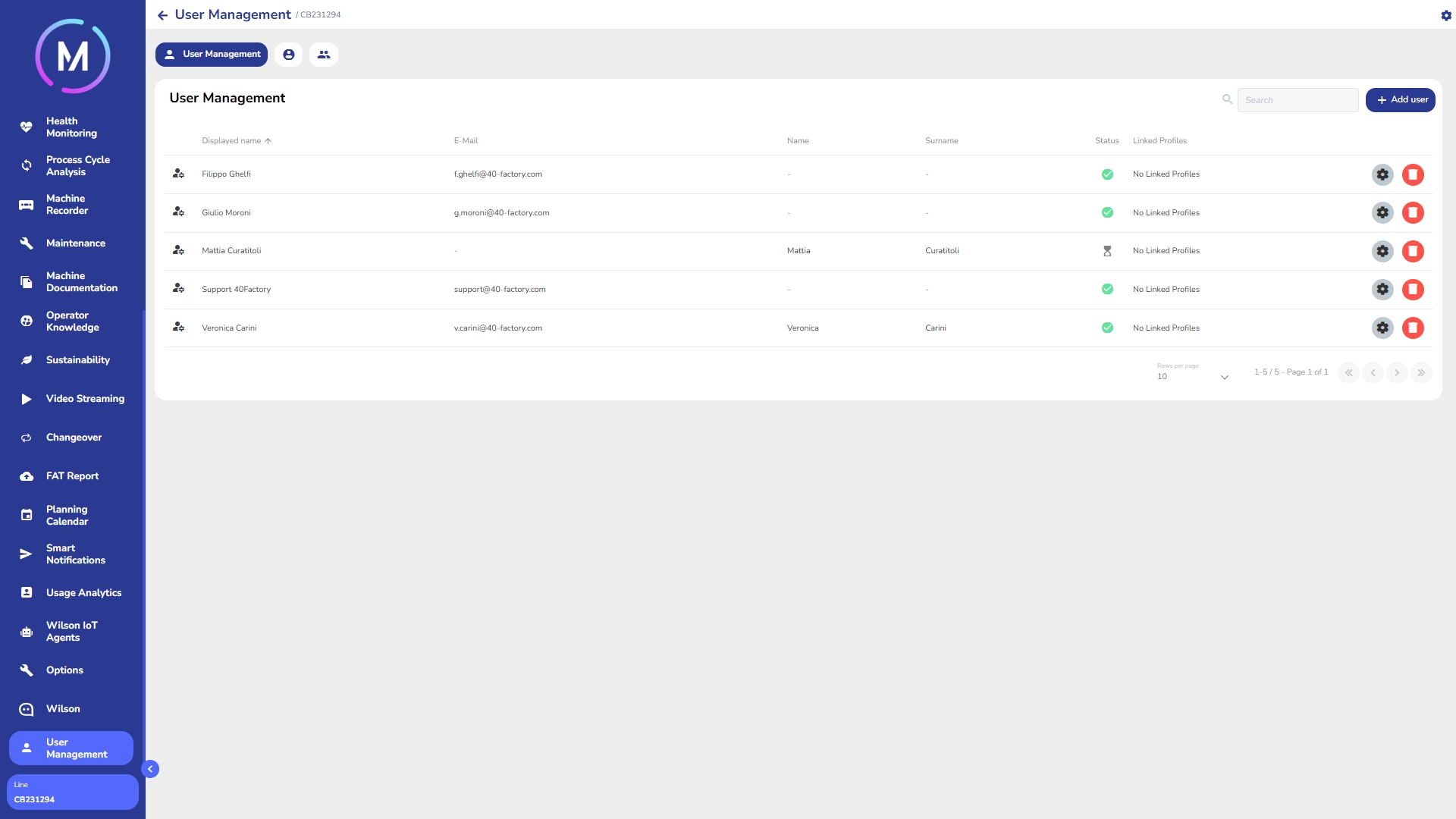 In questa sezione è possibile visualizzare tutti gli utenti che hanno accesso all'applicazione corrente. Per ciascun utente vengono mostrate alcune informazioni, come il nome, il cognome e gli indirizzi email associati. Inoltre, sono indicati i profili di appartenenza e lo stato dell’utente, ovvero se ha già accettato l’invito ad accedere all’applicazione o se è ancora in attesa di conferma.