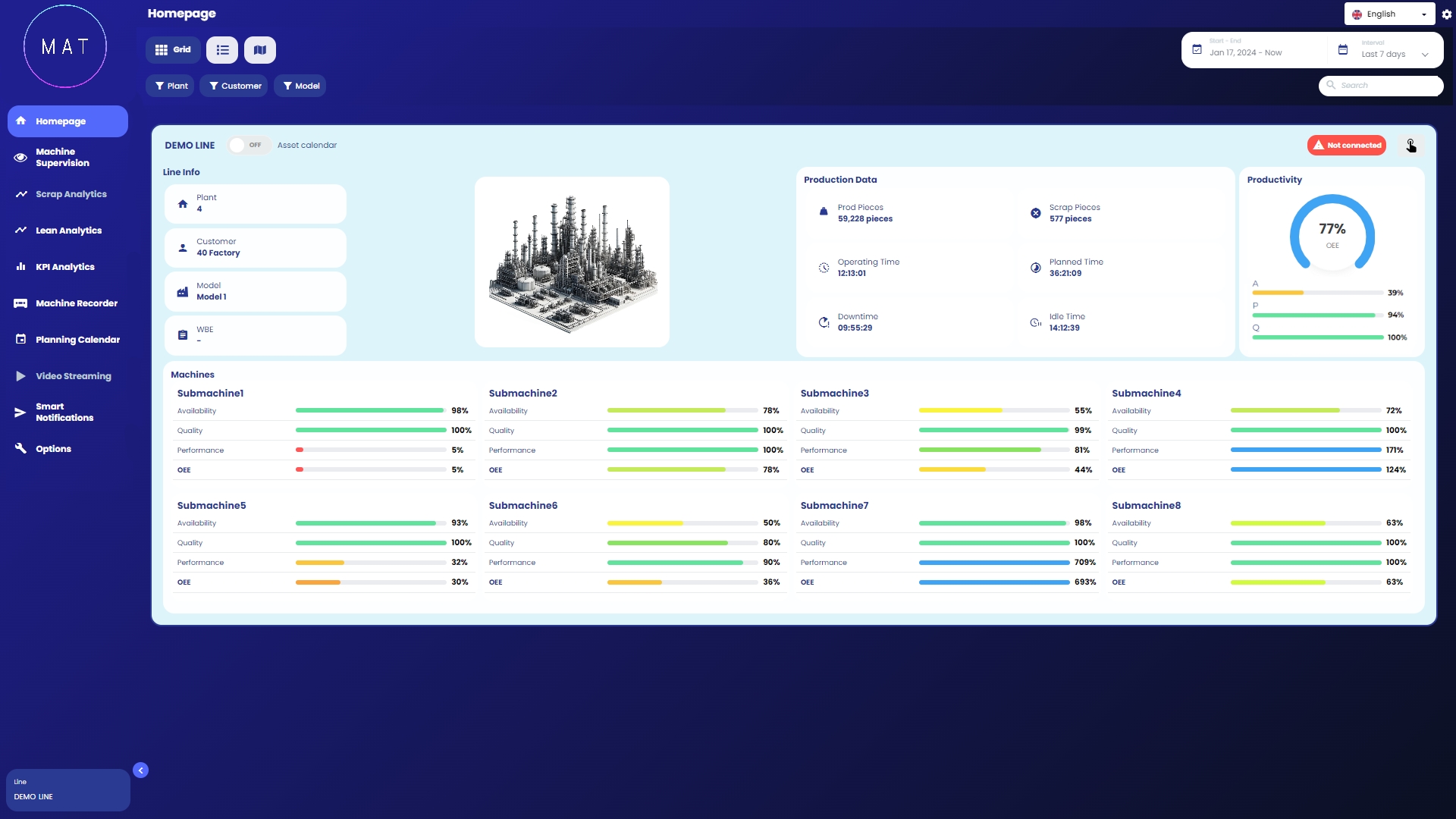 La pagina è suddivisa in cards (una per ogni macchina o impianto connesso) ciascuna delle quali riepiloga le principali informazioni inerenti a una specifica macchina/linea, come: dati anagrafici, valore dell'OEE e delle sue componenti e altri dati riepilogativi inerenti all’efficienza della macchina/linea (es. tempo operativo, tempo produttivo, down-time, pezzi prodotti, quantitativi di scarto, coefficienti energetici, stato di salute stazioni).