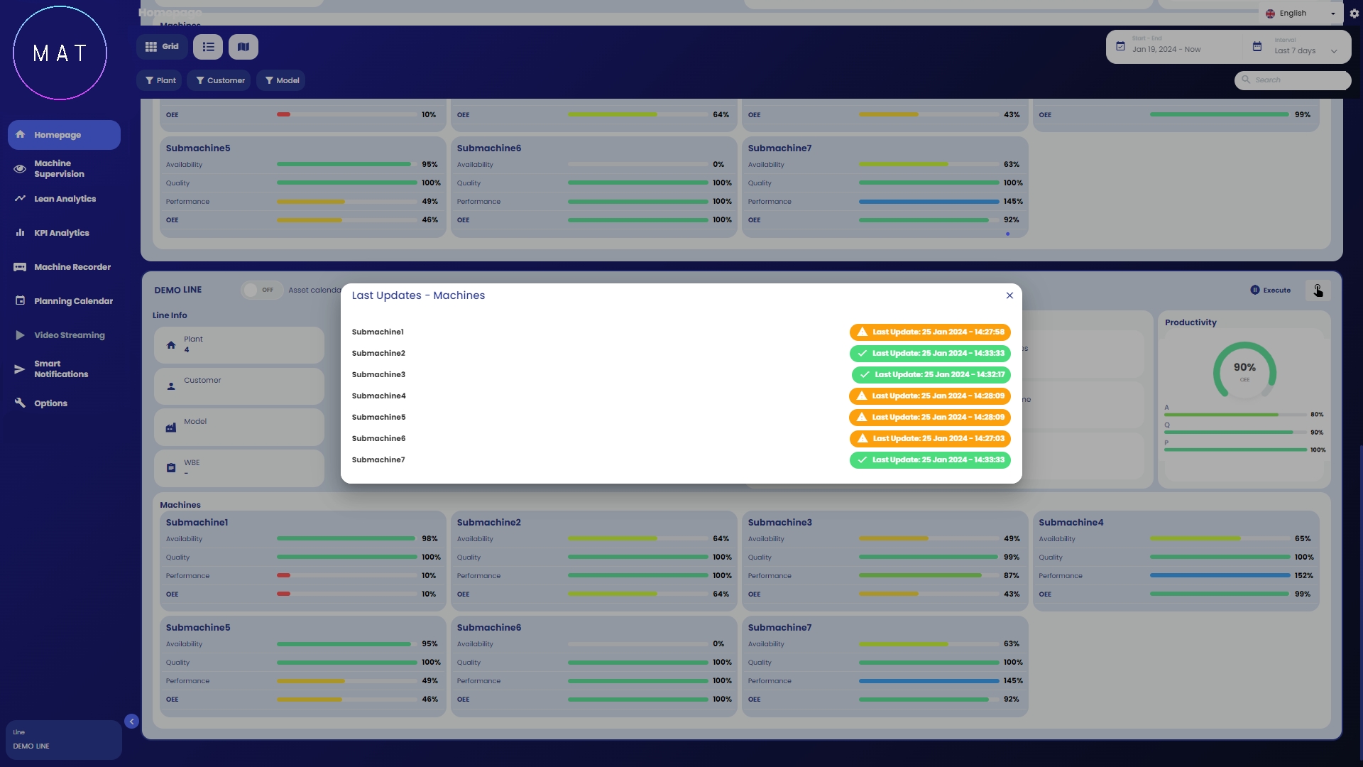 selezionando un determinato periodo temporale d’analisi, le informazioni riepilogative contenute nelle cards vengono aggiornate di conseguenza. Ciò consente, per esempio, di visualizzare in modo immediato una sintesi del comportamento della macchina/linea nell’ultima settimana, o nell’ultimo mese;